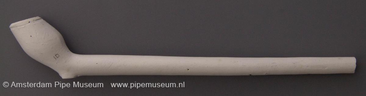 | Tabakspijp van klei met dubbelconische ketel, hiel en rechte steel. Filtradering. Onversierd. Steel enkele schilfers afgesprongen door oxiderende insluitsels in de klei. |