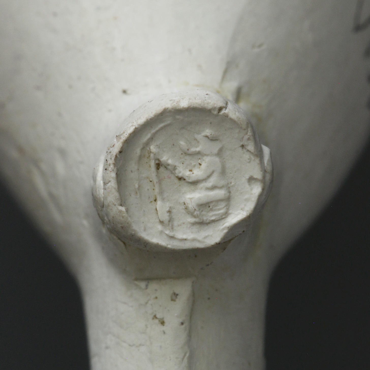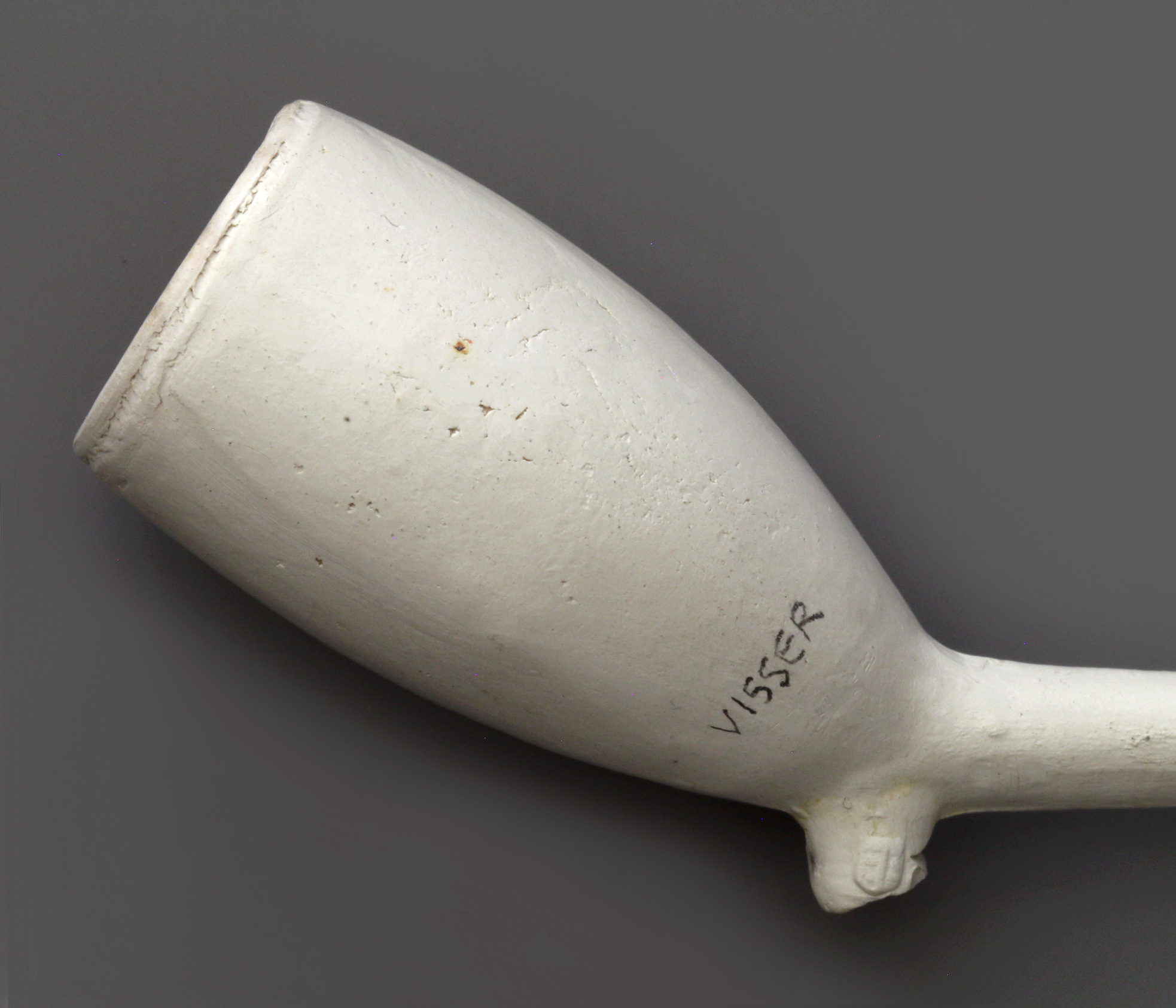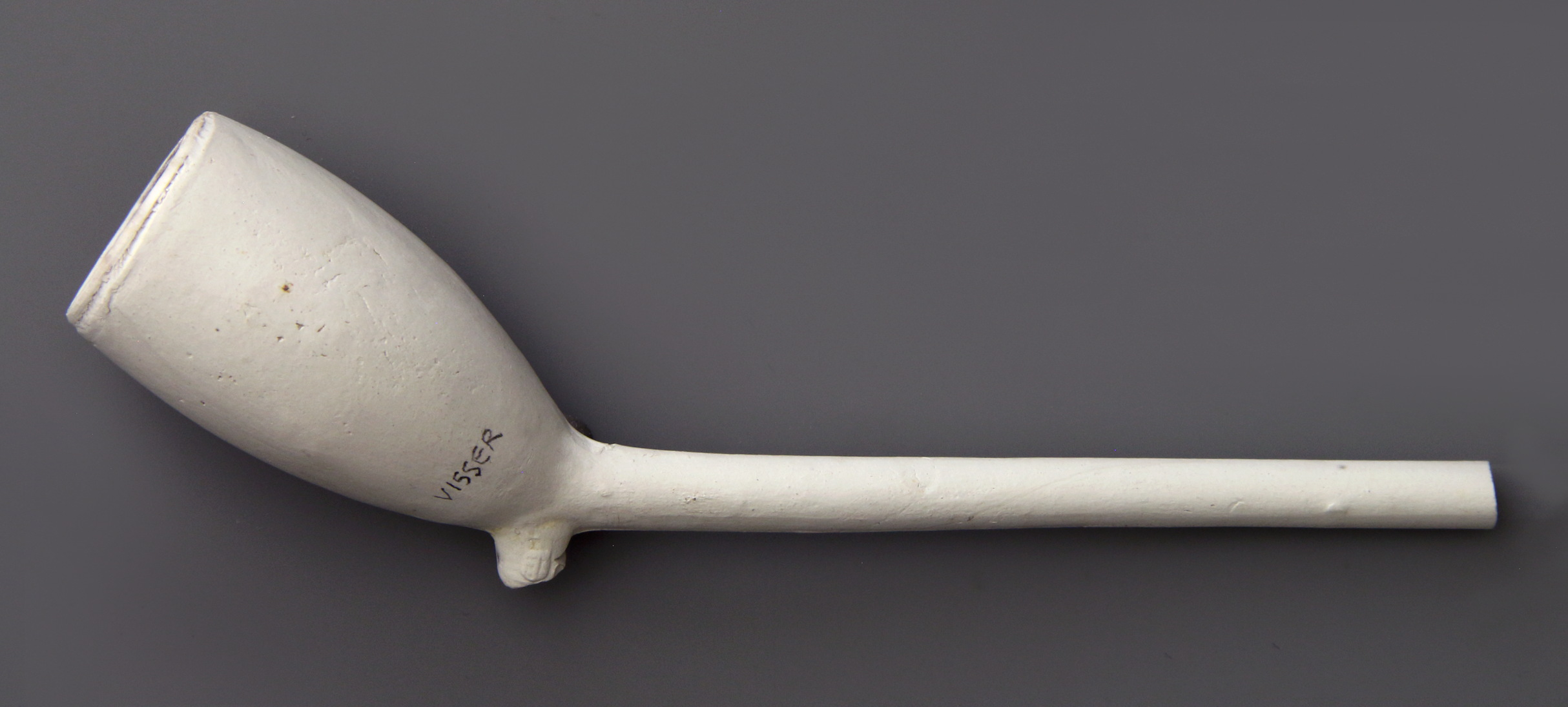 | Tabakspijp van klei met ovale ketel, hiel en rechte steel. Filtradering. Ketel geglaasd. Hiel weerszijden bijmerk Gouds wapenschild |