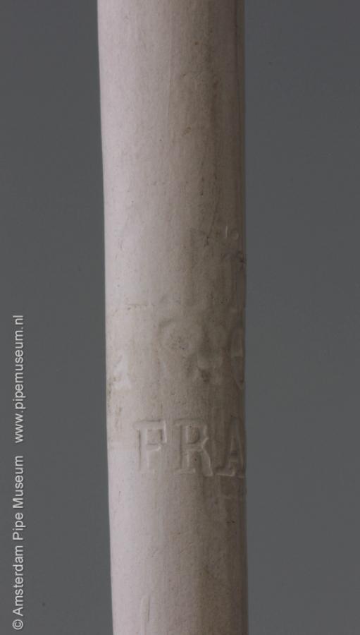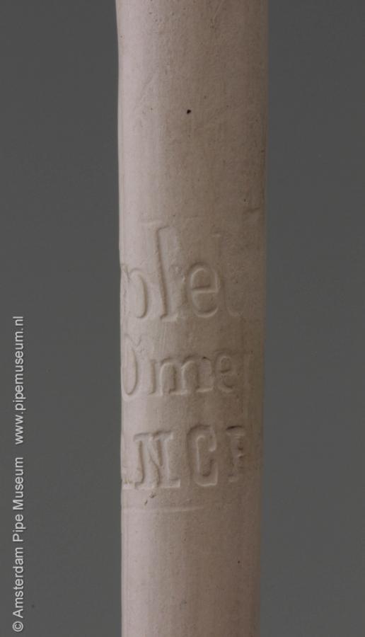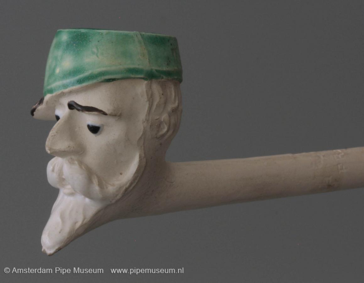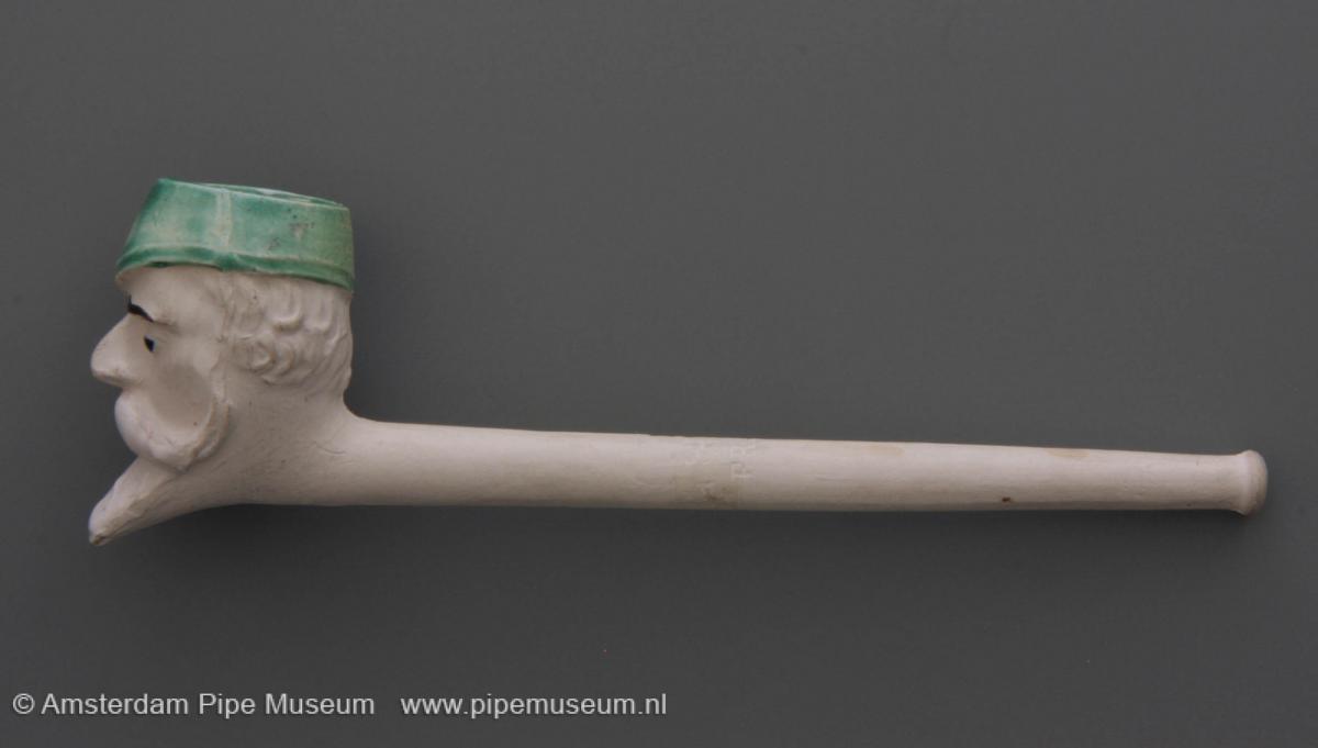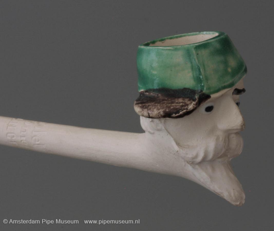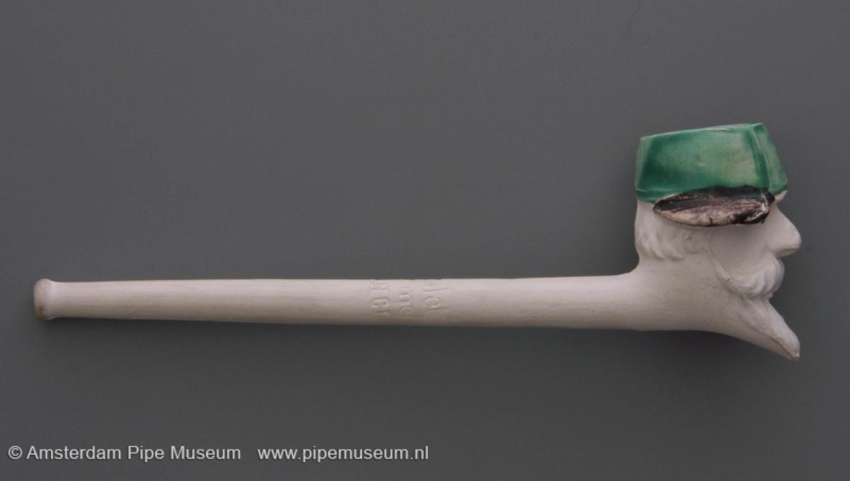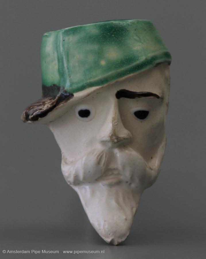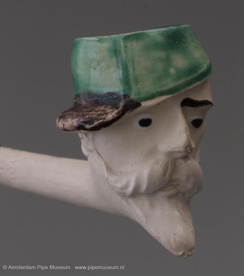 | Tabakspijp van klei met figurale ketel, zonder hiel en rechte steel met knoop. Ketel hoofd man met snor en sik, een pet met de klep naar links. Schilderemail in groen (pet), zwart en wit. Steel intaglio "L. FIOLET ST. OMER FRANCE". |