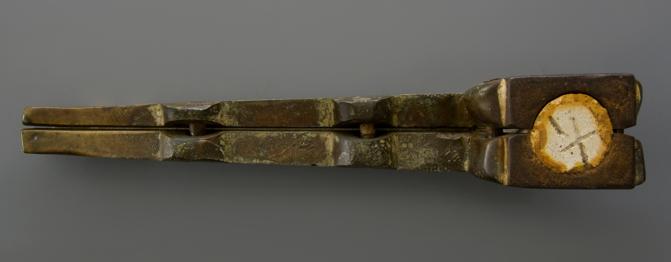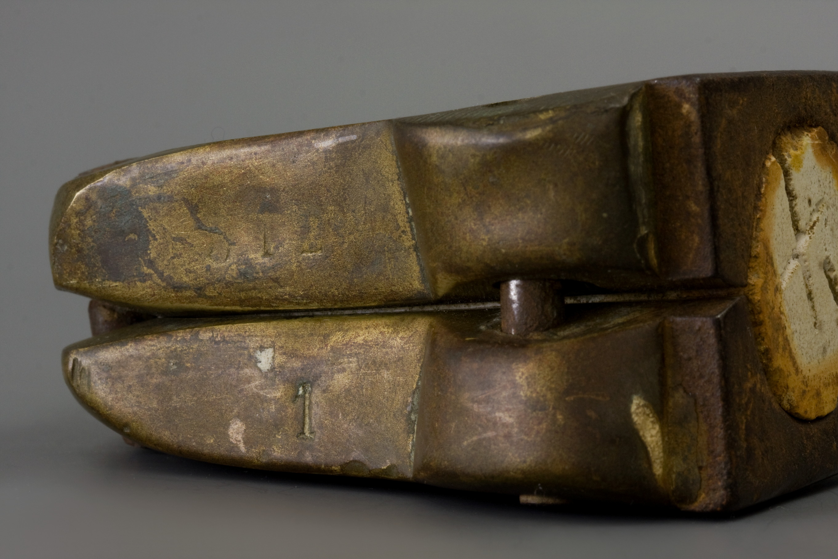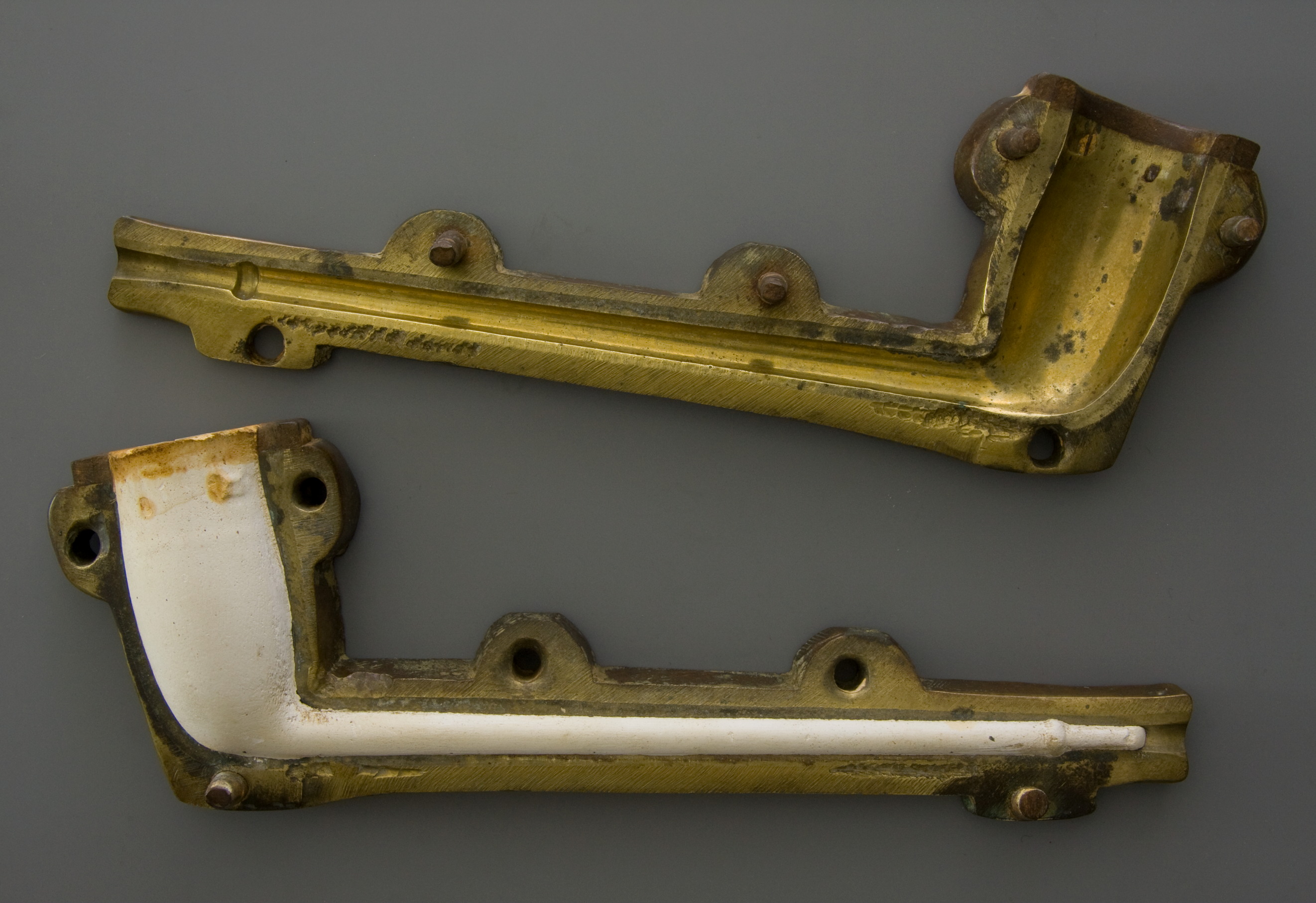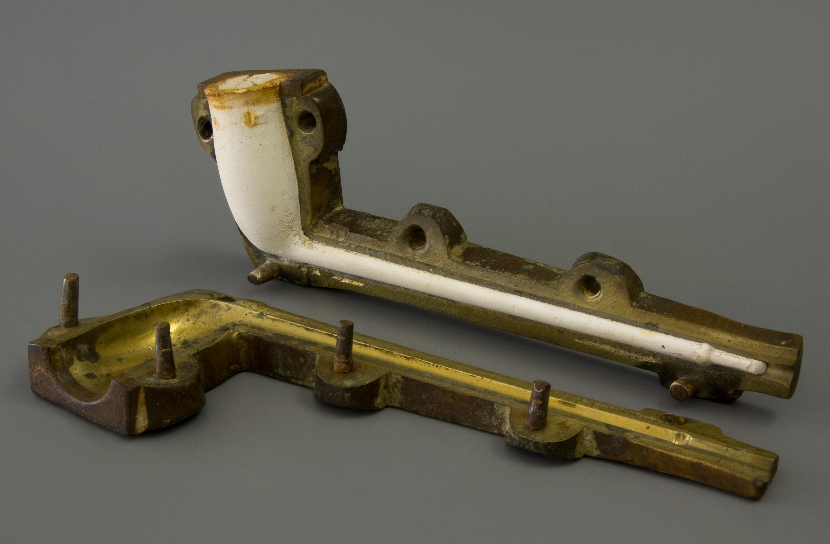 | Persvorm van messing in twee delen voor tabakspijp met doetel ketel, zonder hiel en rechte steel met knoop. Onversierd. Vormhecht zes ijzeren sluitpennen, ketelopening met ijzeren stopperplaat. Vormkast ketel ingeslagen modelnummer "312/1 ". Volgegoten met gips. Vormkast steel buitenzijde de vorm met een groot kruis ongeldig gemaakt. |