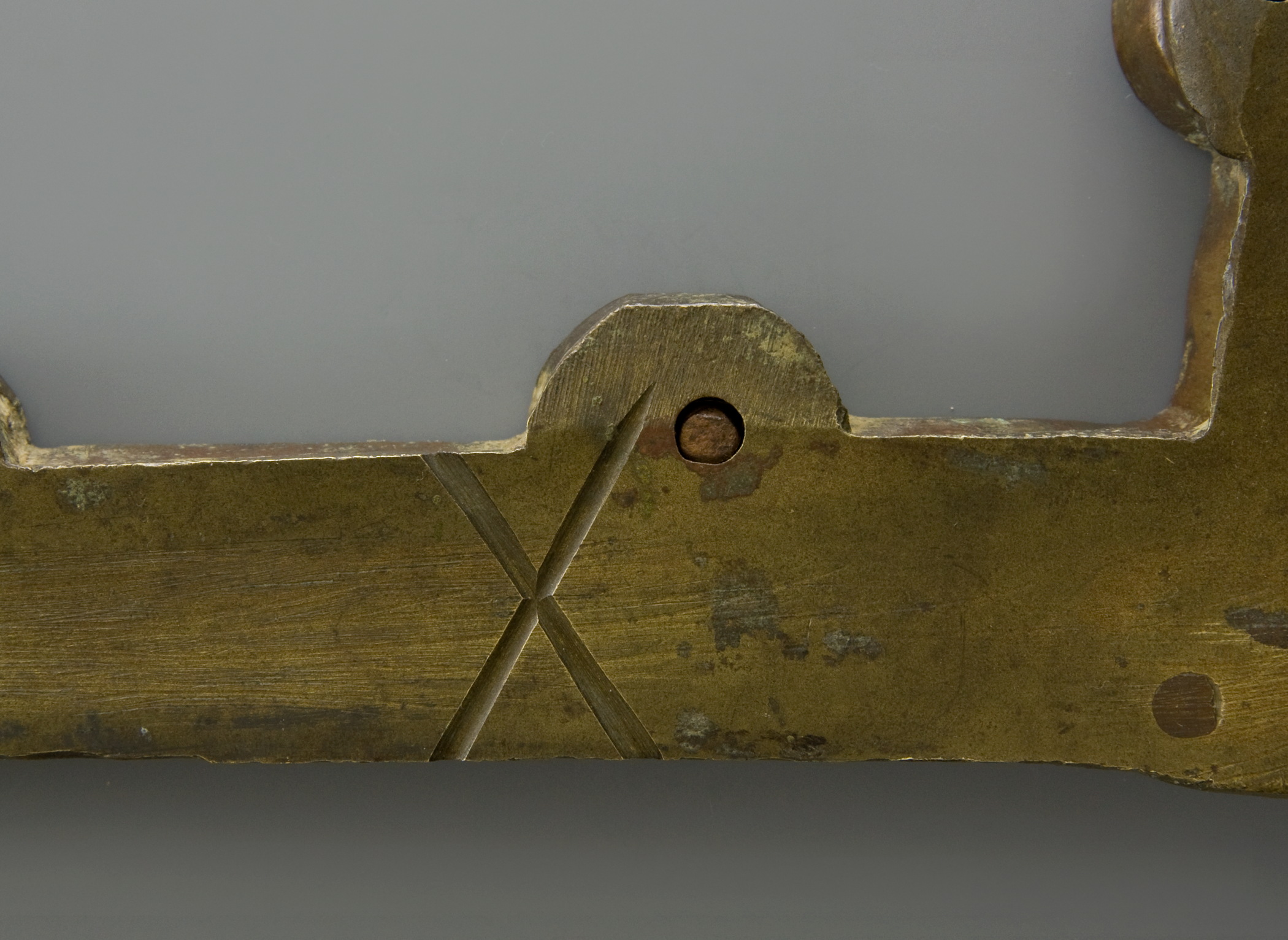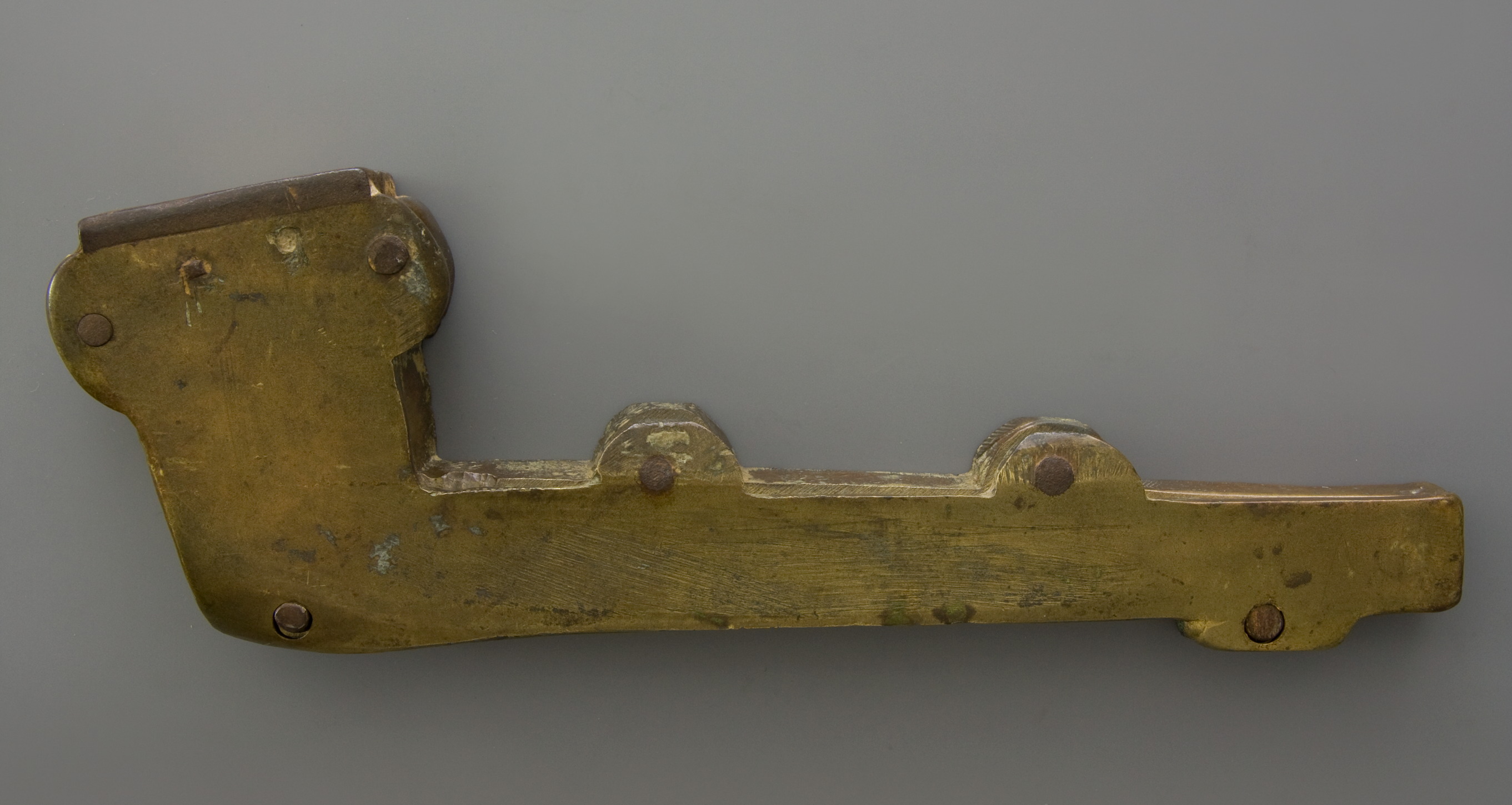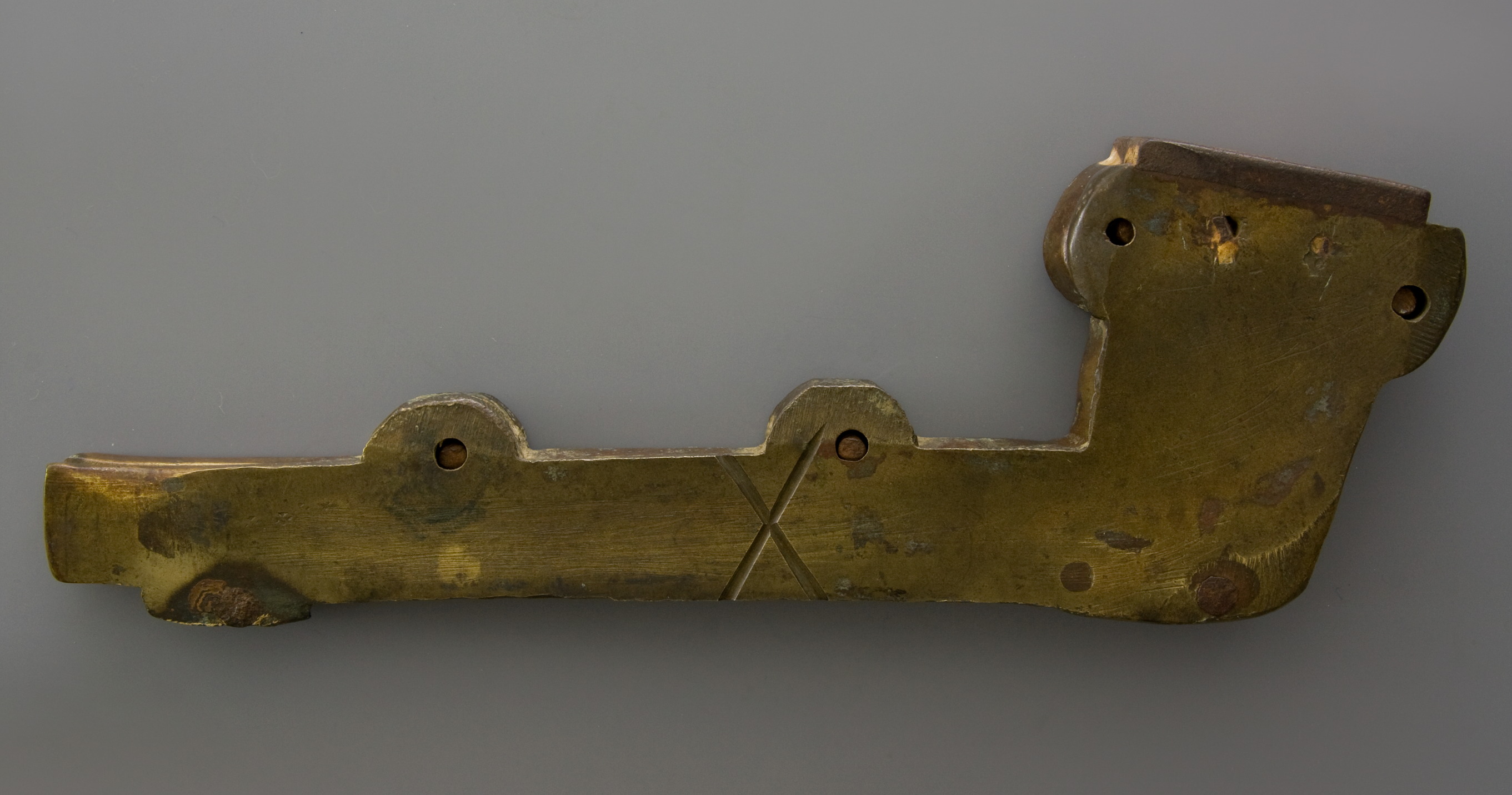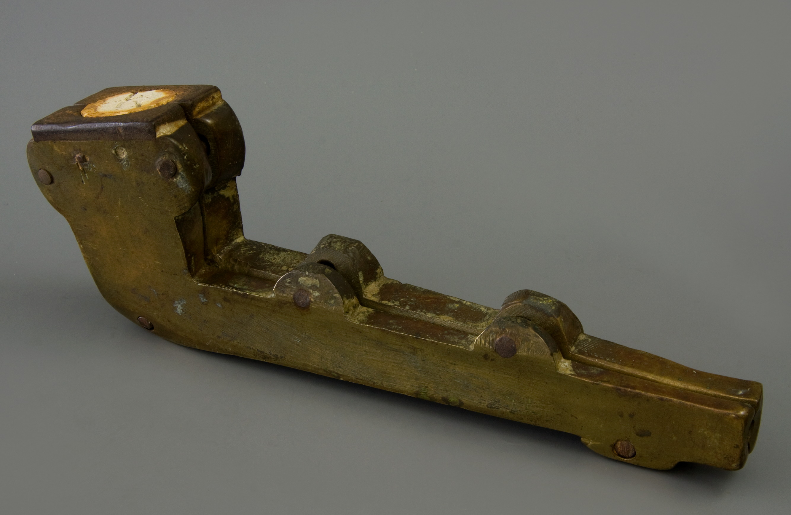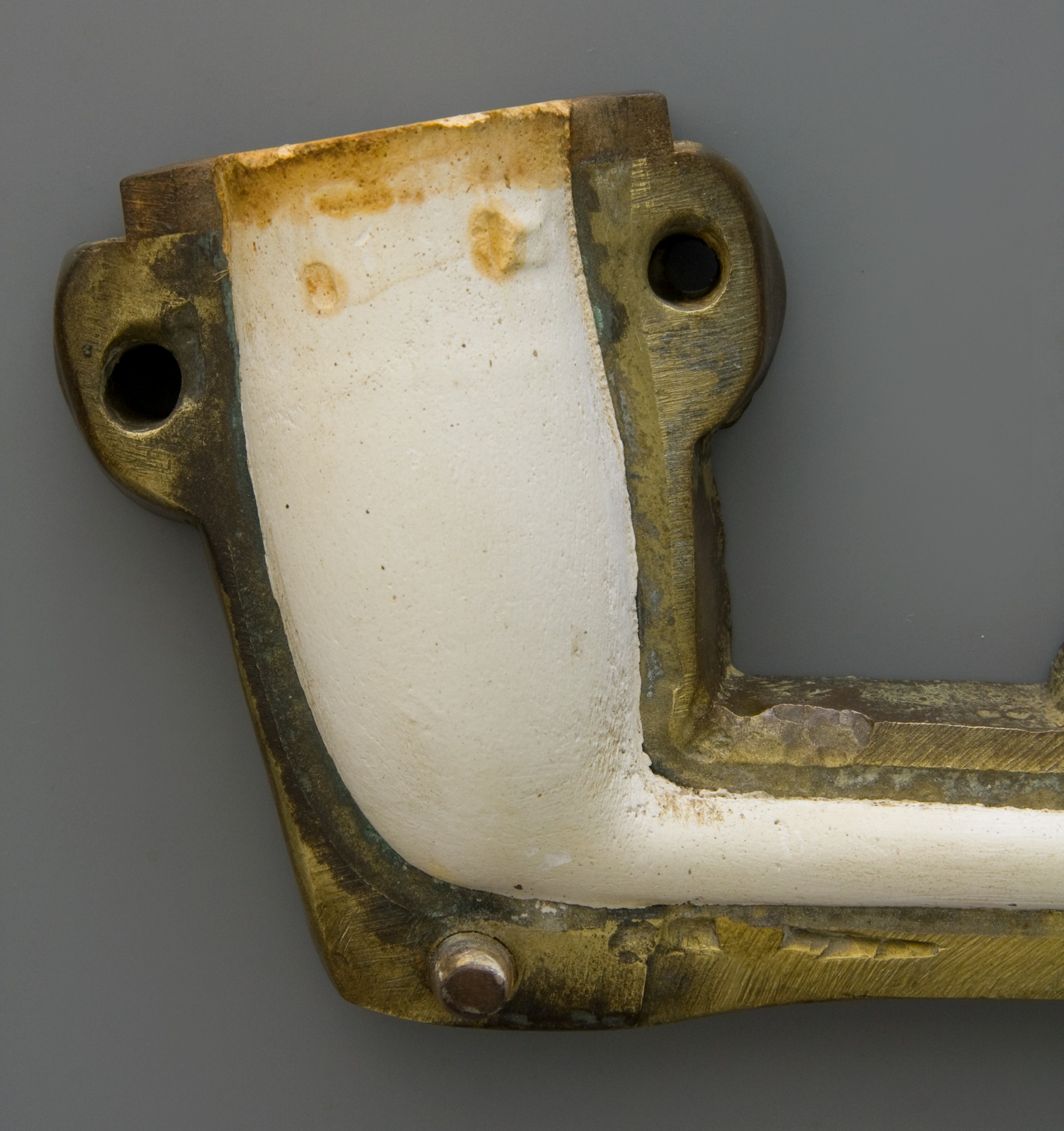 | Persvorm van messing in twee delen voor tabakspijp met doetel ketel, zonder hiel en rechte steel met knoop. Onversierd. Vormhecht zes ijzeren sluitpennen, ketelopening met ijzeren stopperplaat. Vormkast ketel ingeslagen modelnummer "312/1 ". Volgegoten met gips. Vormkast steel buitenzijde de vorm met een groot kruis ongeldig gemaakt. |