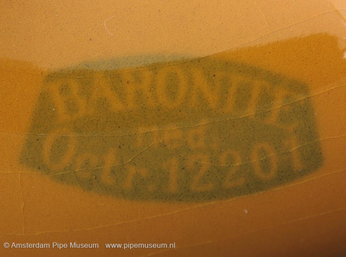 | Tabakspijp van gietklei met holwandige grote billiardvorm ketel, zonder hiel en oplopende steel met conische manchet. Gespoten in calcinéafwerking. Steel links stempel met blauwe onderglazuurverf "BARONITE NED. OCTR. 12201". Oorspronkelijk weichselhouten roer met wit hoornen mondstuk. |