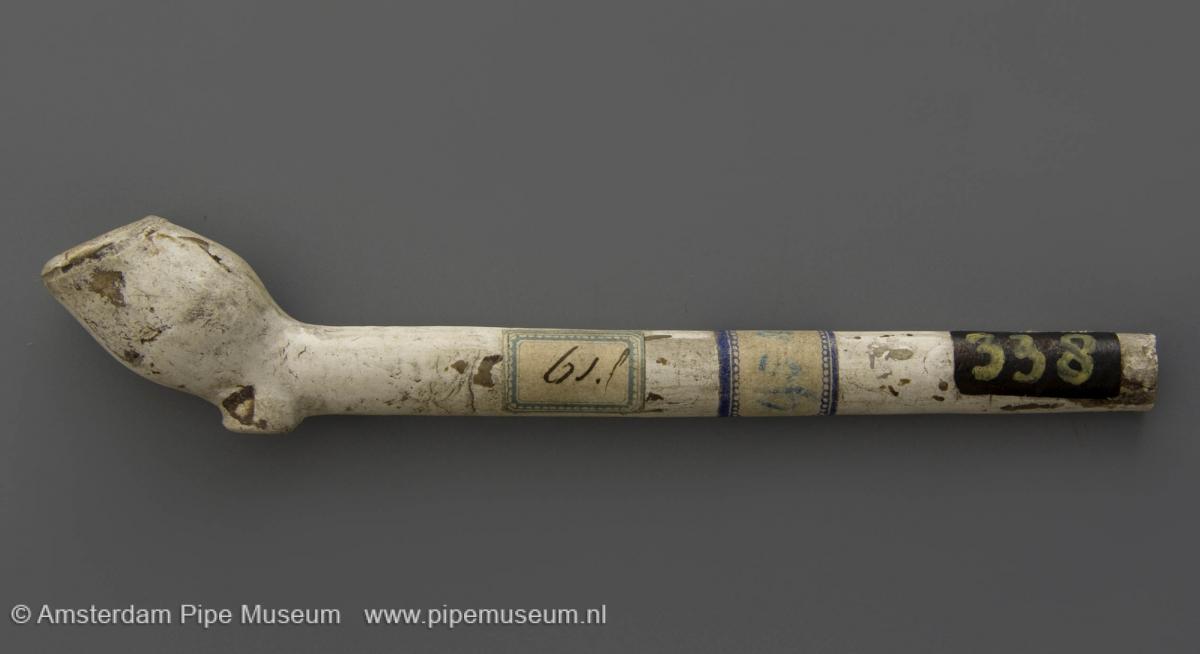 | Tabakspijp van klei met dubbelconische ketel, hiel en rechte steel. Filtradering. Ketel en steel geglaasd. Oude museumetiketten met "61F", "958"en "338". |
