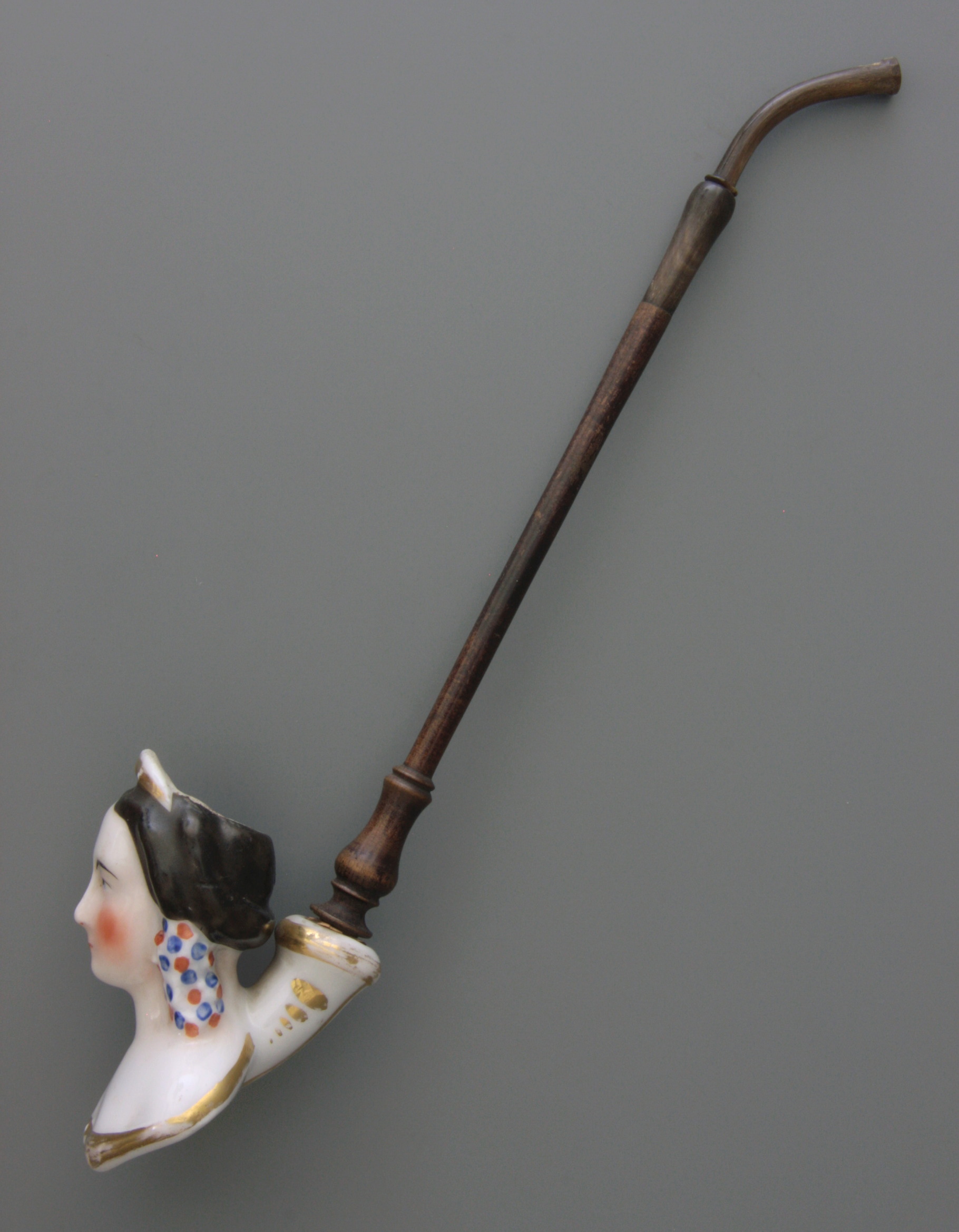 | Tabakspijp van porselein met figurale ketel, zonder hiel en oplopende steel met manchet. Ketel borstbeeld Eugénie de Montijo met kleine kroon en grote oorhangers, gedecolleteerd. Decoratie met rood, blauw, zwart en goud gehoogd. Borstbeeld onderzijde geometrisch patroon van bladgoud. Oorspronkelijk gedraaid houten roer met hoornen beet. |