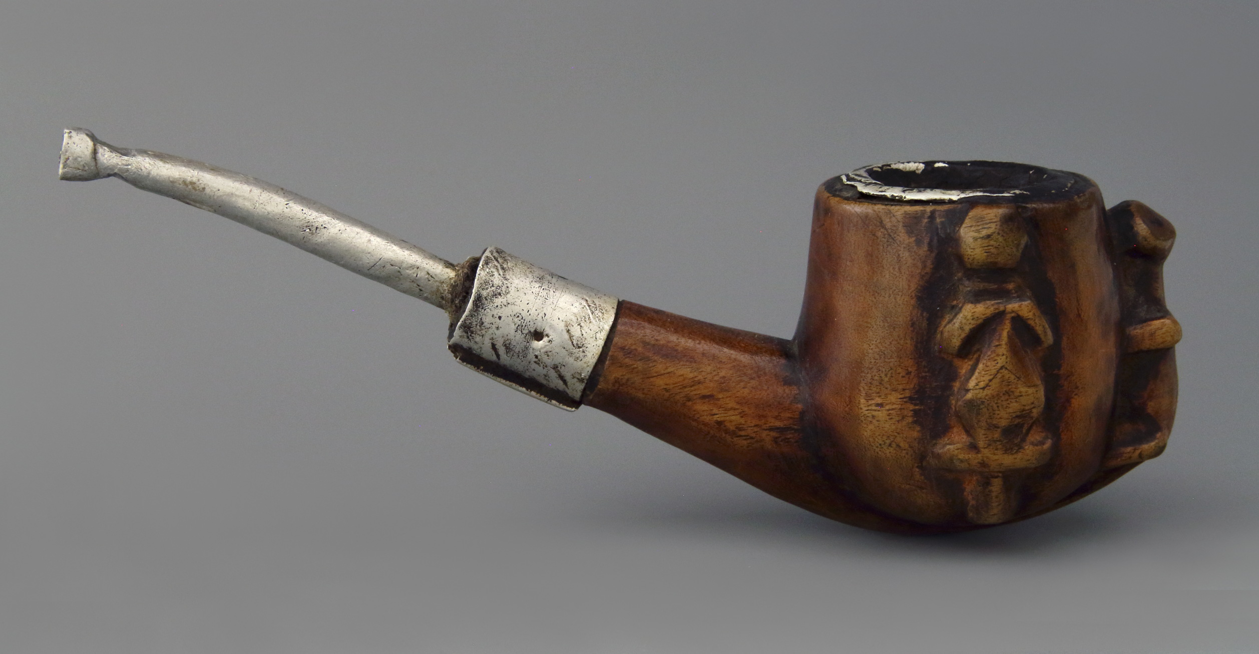 | Tabakspijp van hout met cilindrische licht vierzijdige ketel, zonder hiel en iets opgaande rechte steel. Ketel rondom in reliëf drie staandfe figuurtjes, de voorste met een staart onder langs de ketel. Oorspronkelijke montage met aluminium binnenketel, aluminium busje om het steeleind en bijna recht aluminium roer met knopmondstuk. |