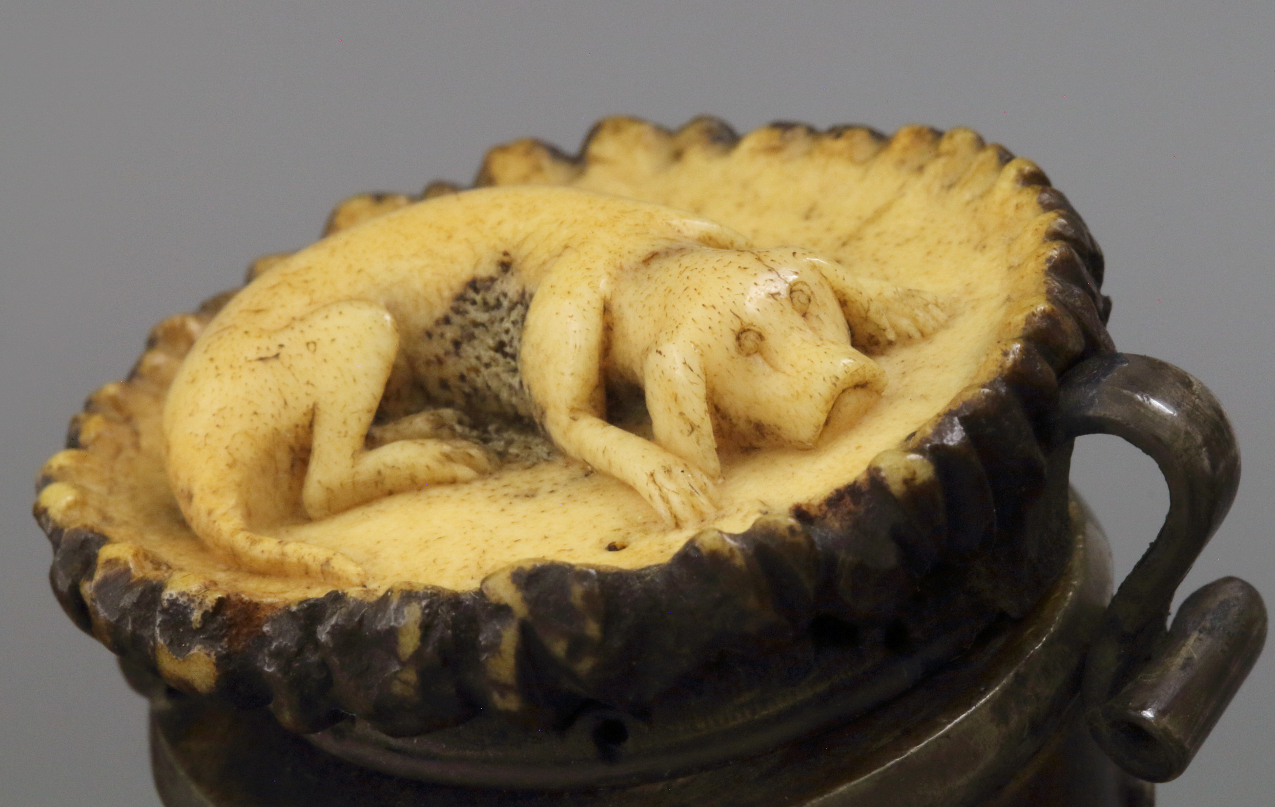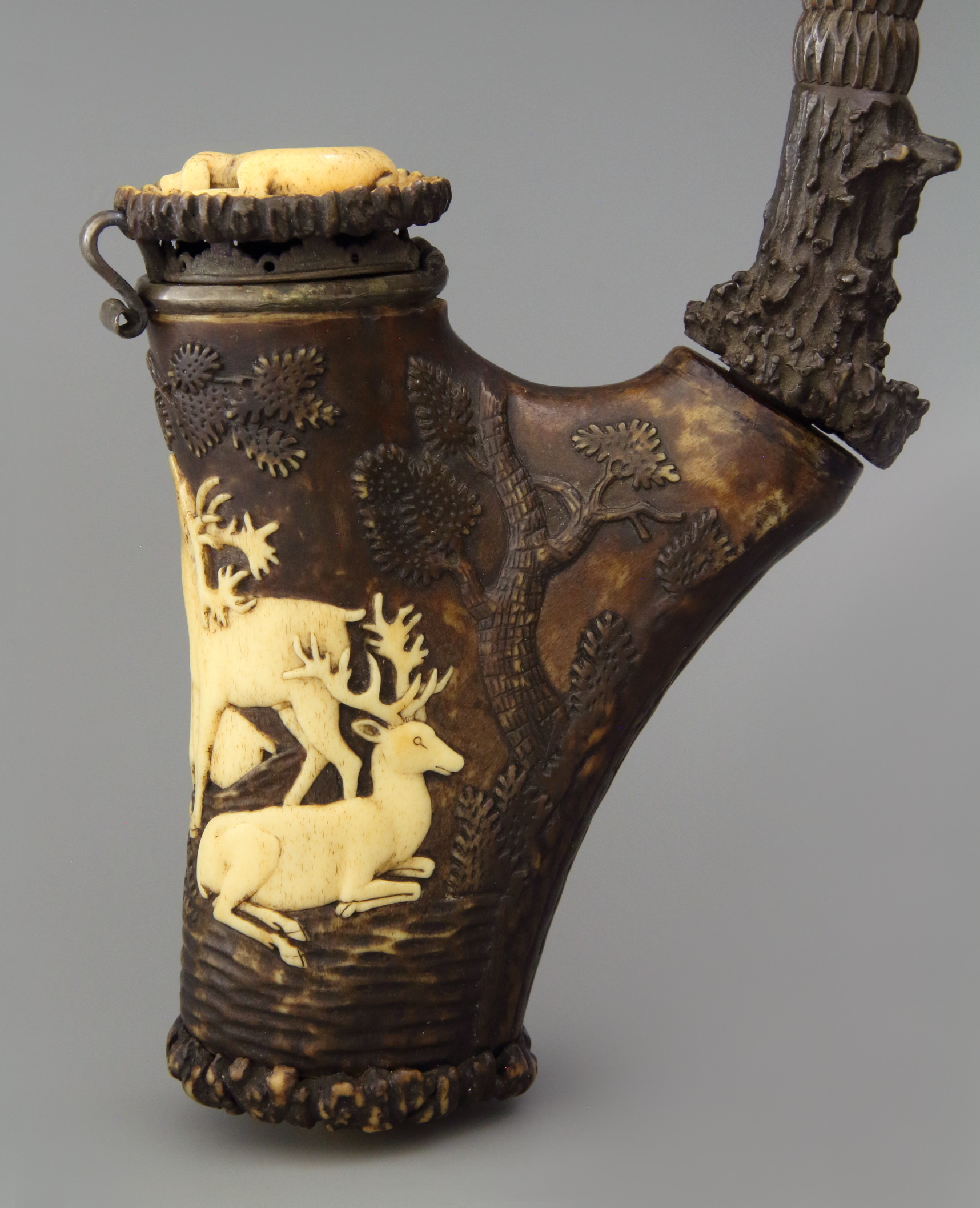 | Tabakspijp van hertshoorn met v-vorm met cilindrische ketel, vlakke onderzijde met knopje en oplopende steel zonder manchet. Ketel voorzijde in reliëf groep van zes herten, tegen de achtergrond dennenbomen en boomstronken. Oorspronkelijke montage met een ovaalvormig klepdeksel met centraal een liggende hond, opgaande insteeksteel van kralen hertengewei eindigend in een kroon en met een knik zijwaarts. |