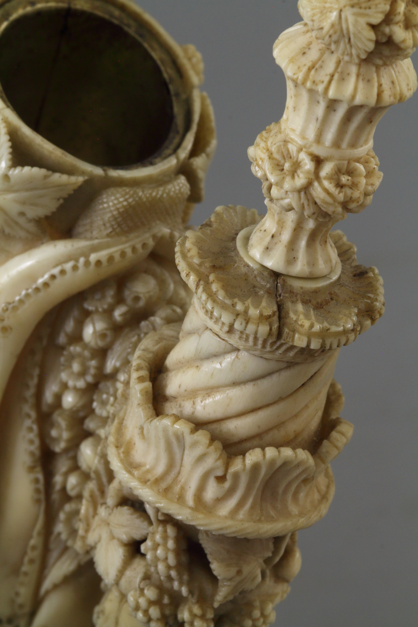 | Tabakspijp van ivoor met figurale ketel, figural basis en opgaande steel met flexibel steeleind en knopmondstuk. Ketel het borstbeeld van een vrouw met parelketting en vier verschillende kanten kragen boven elkaar, het haar met wingerdranken met druiventrossen, achter het hoofd de plooien van een afhangende sluier, onder de afsnede van de boezem de gebogen nek en kop van een adelaar. Opgaande rechte steel in onderdelen, de onderste punt met wingerdranken met druiventrossen, het bovenstuk met randen gestileerde bladmotieven. Oorspronkelijke montage met benen steel in vijf delen met balustervormen en bloeiende bloemen, een deel als slap met ringetjes bekleed, afgeplat benen mondstuk. |