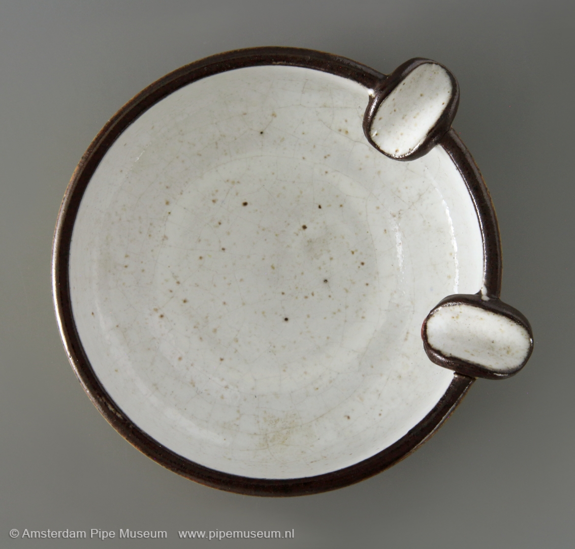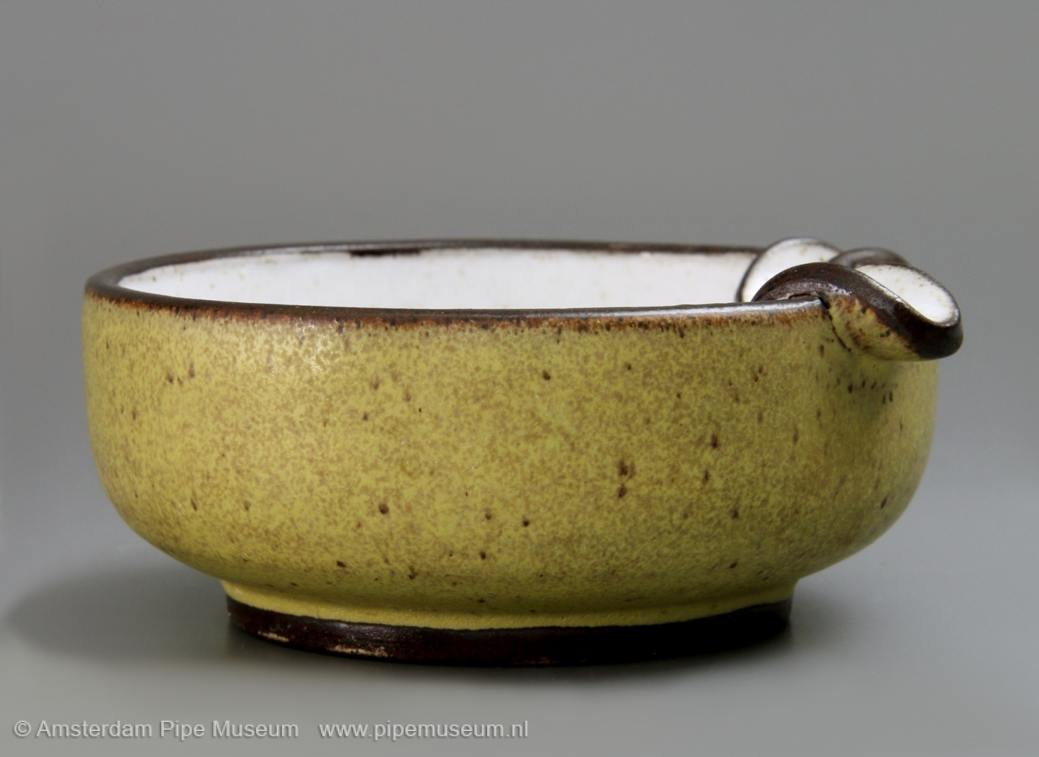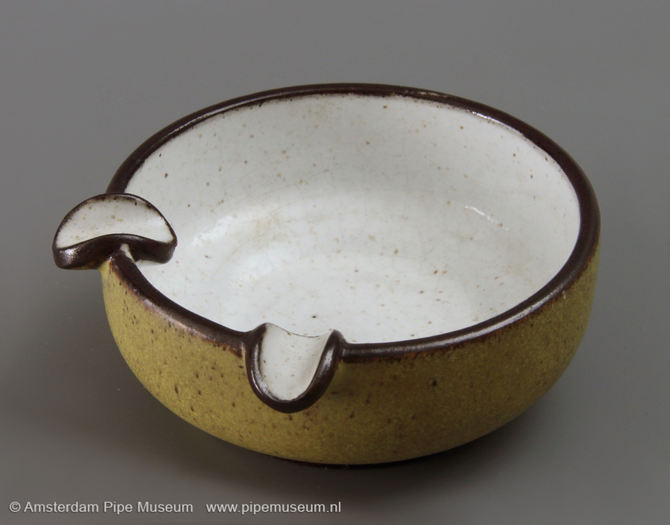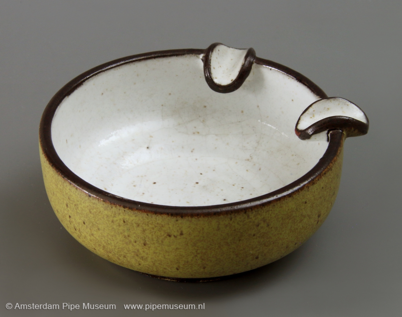 | Tafelasbak van aardewerk met ronde komvorm met kleine standring, op de rand twee sigarettenleggers. Bruinrode scherf afgewerkt in mat geglazuurd geel, binnenzijde wit, bovenrand bruin. Bodem onderzijde intaglio "ZAALBERG HOLLAND" en "0". |