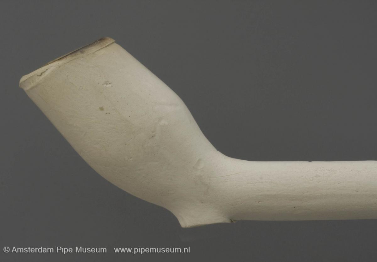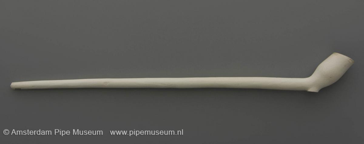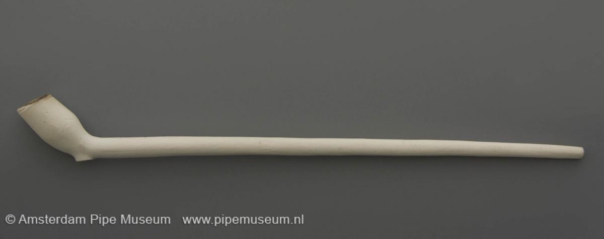 | Tabakspijp van klei met dubbelconische ketel, hiel en rechte steel met glad afgesneden steeleind. Filtgroef. Onversierd. |