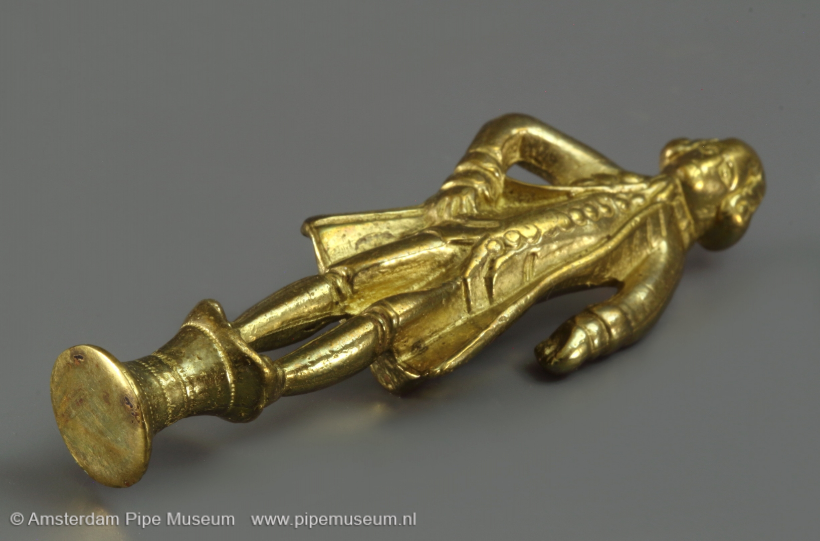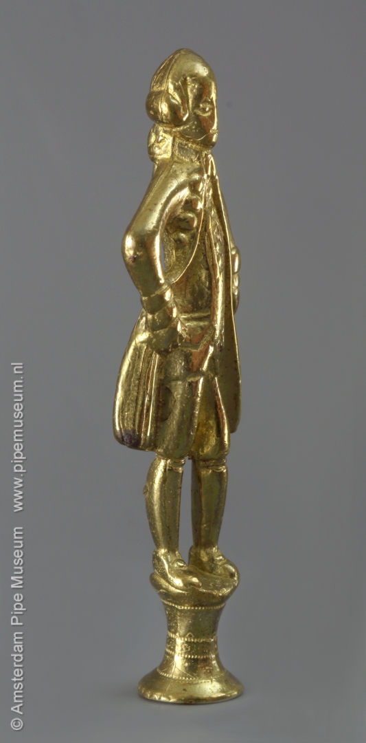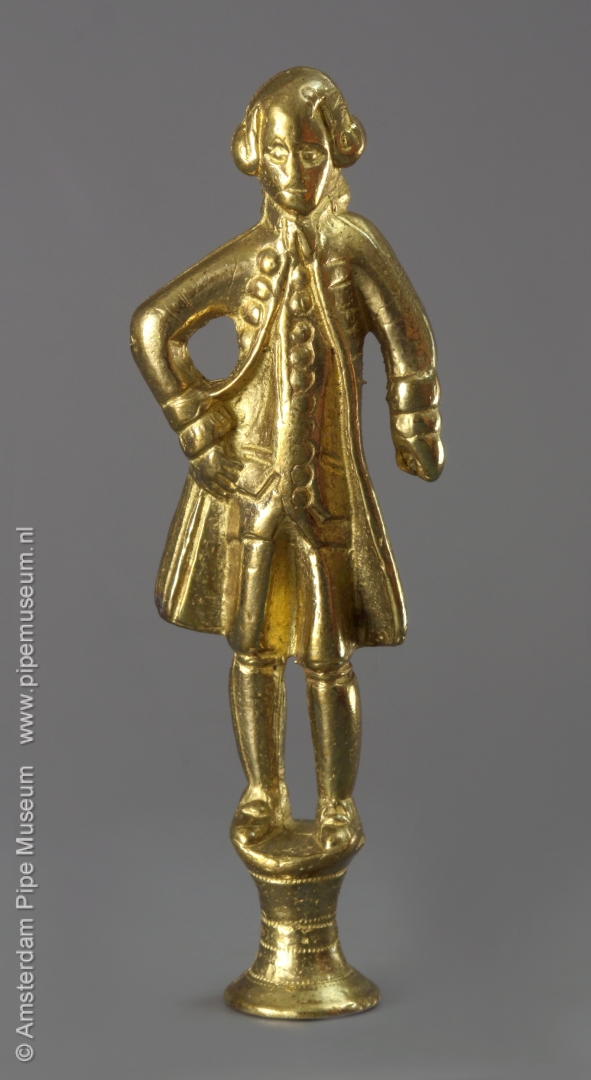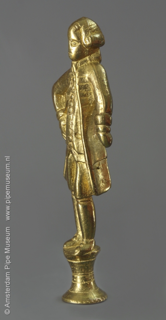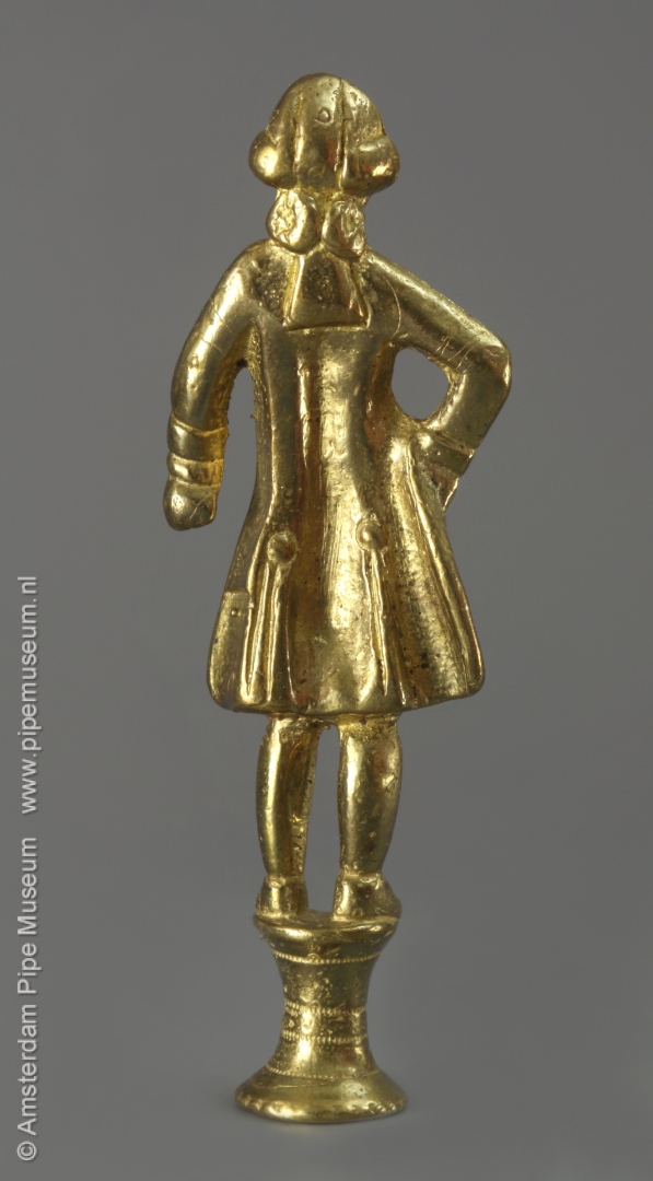 | Pijpenstopper van messing met vlak cirkelvormig stopperdeel op een ingesnoerde stam bekroond door een handgreep van een staande man in historische dracht met een frak, de rechterhand in de jaszak. Sterk tweezijdige voorstelling, de achterzijde met verticale uithollingen om gewicht te besparen. De sokkel ingedrukte stippelrijen. |