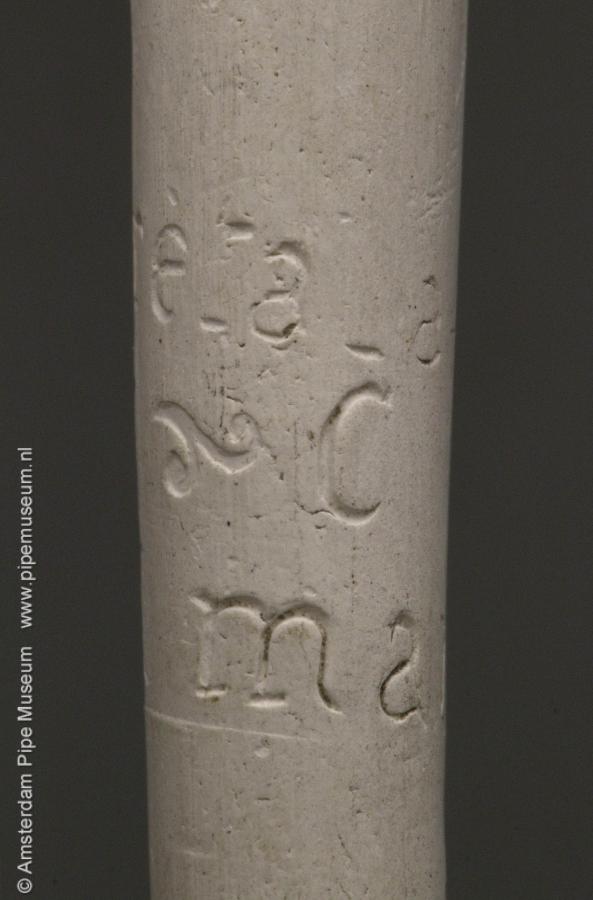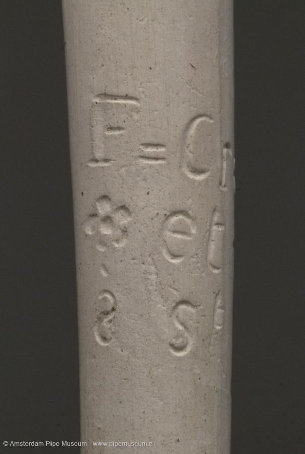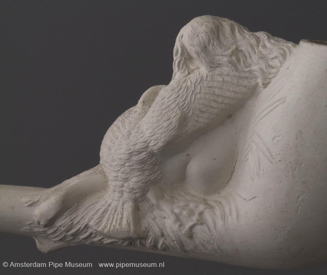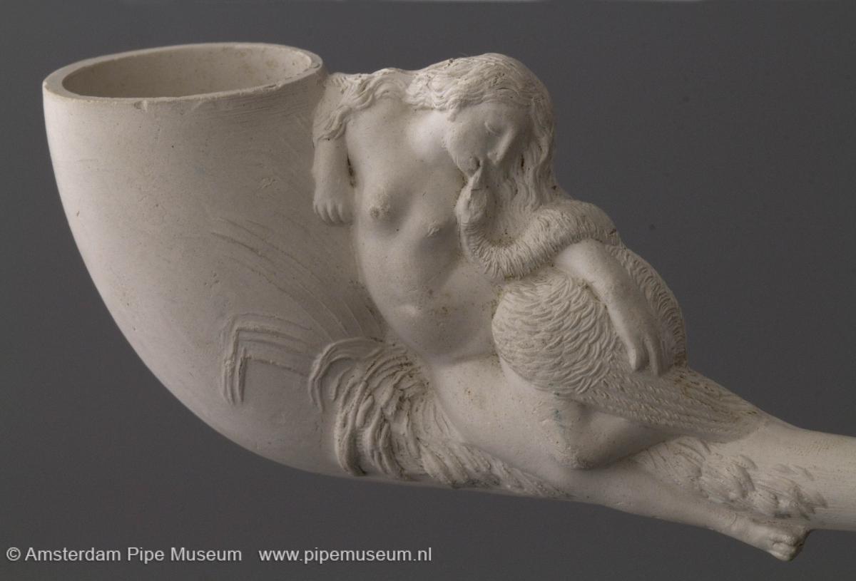 | Tabakspijp van klei met Duitser ketel, zonder hiel en rechte steel. Steelhoek in hoogreliëf liggende vrouw met zwaan. Steel intaglio "F. CRETAL AINE ET CIE A ST. MALO". |