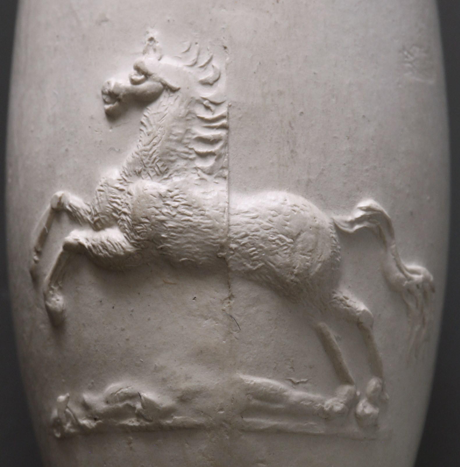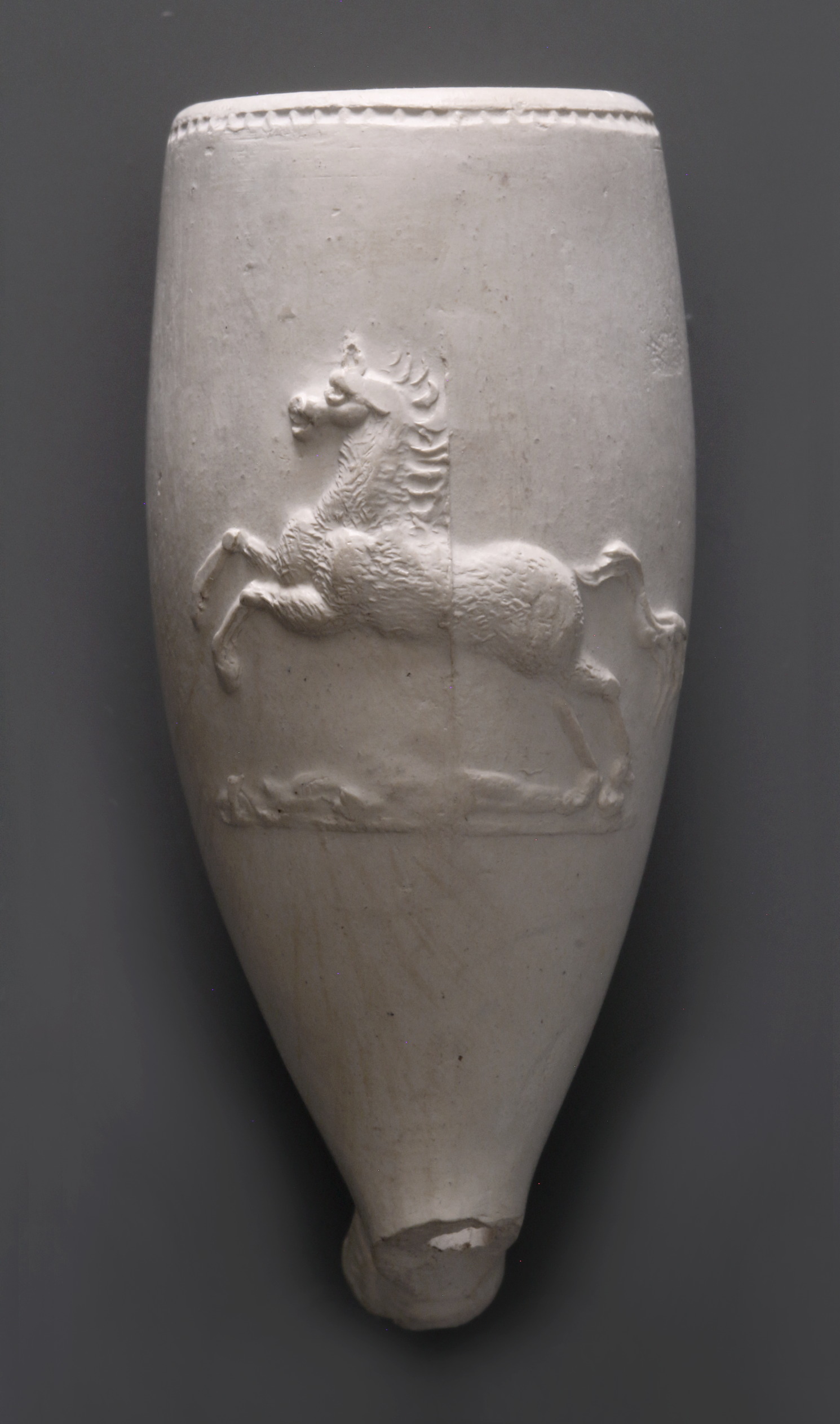 | Tabakspijp van klei met ovaalvorm ketel, hiel en rechte steel. Filtradering. Ketel steelzijde in reliëf naar links springend paard op grondje. Ketel rond de voorstelling geglaasd. Hiel links bijmerk Gouds wapenschild. |