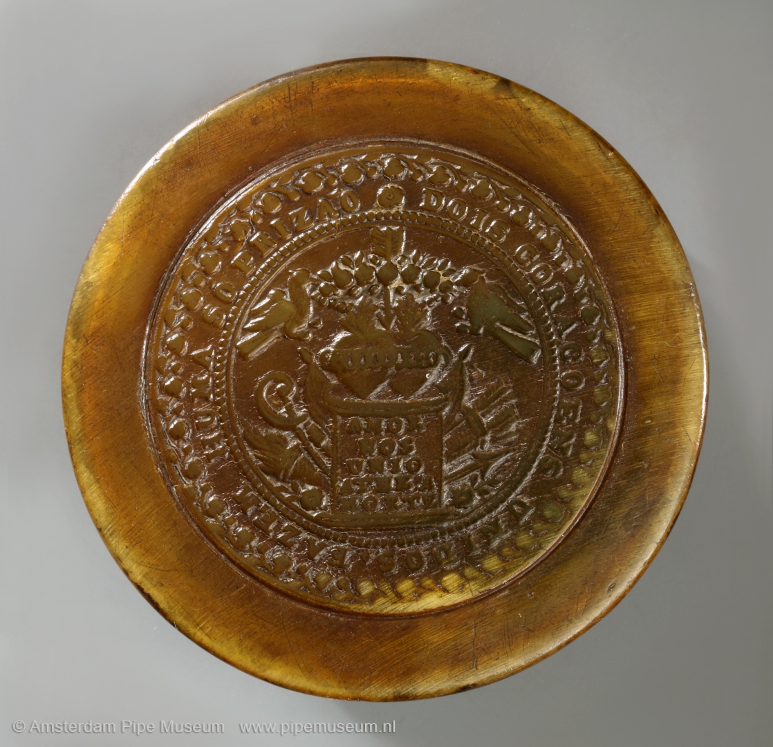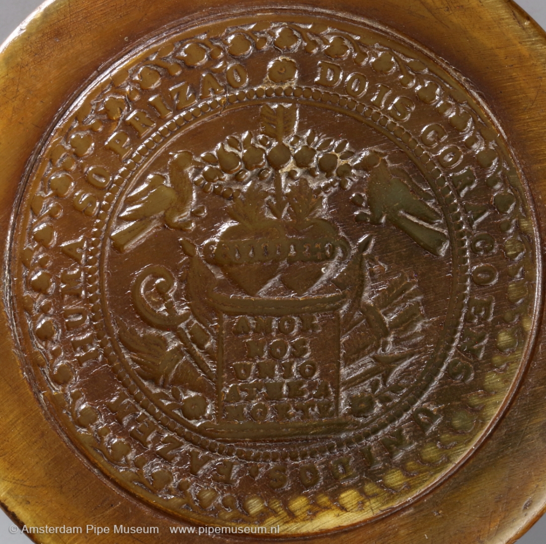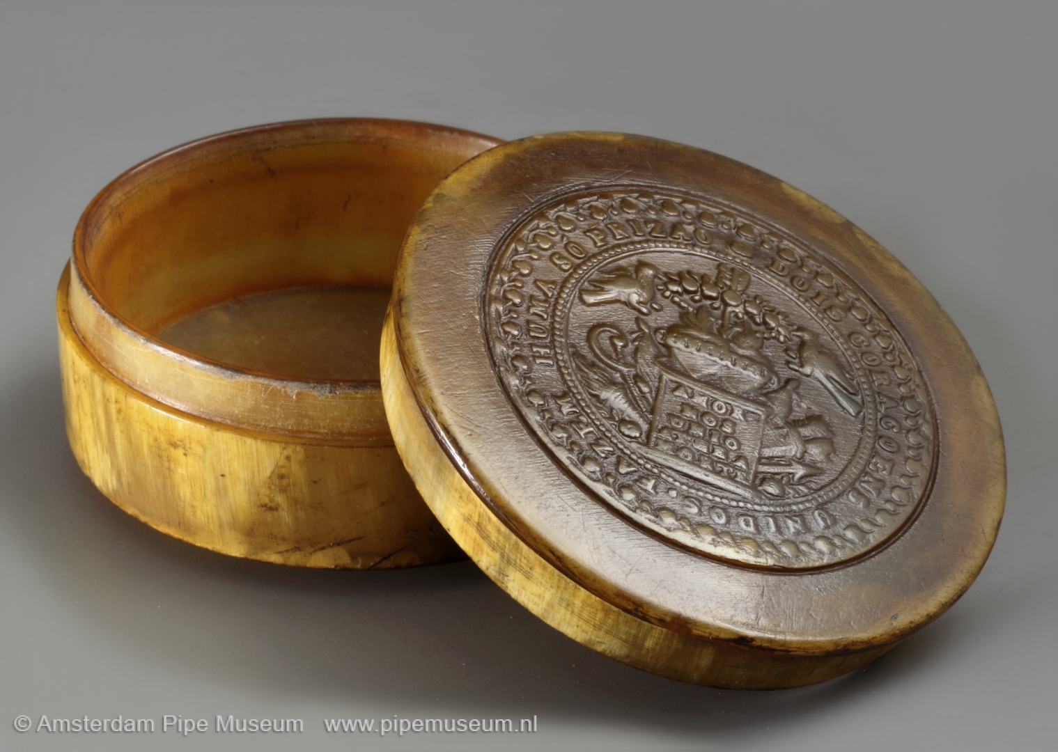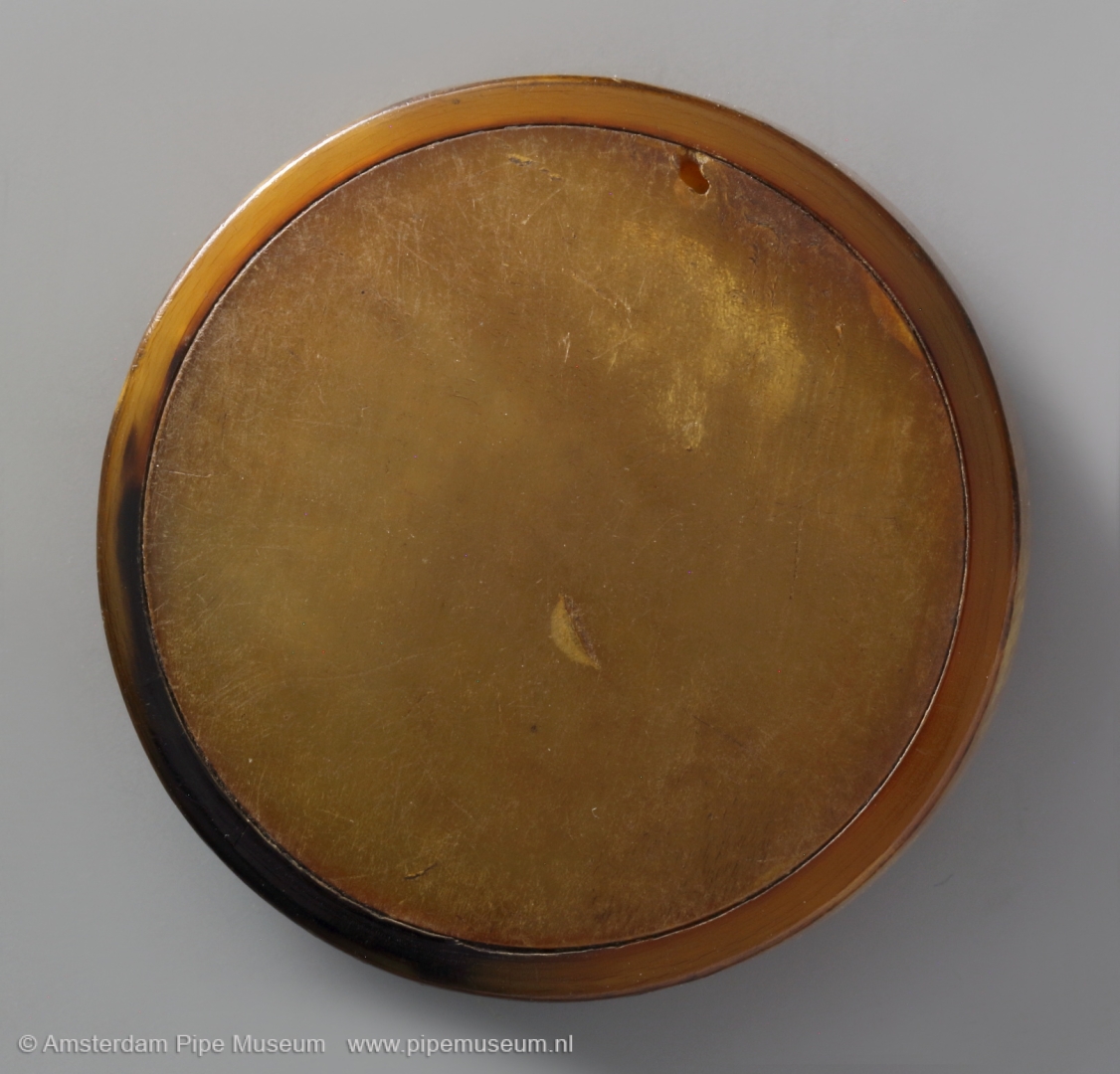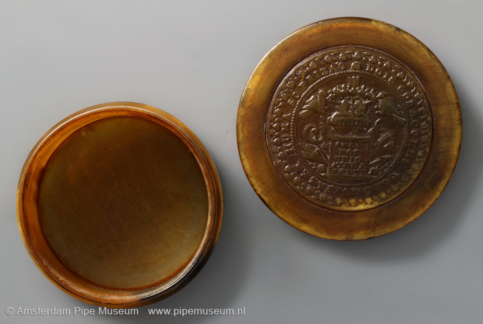 | Snuifdoos van gedrukt buffelhoorn met rond model met licht lensvormige bodem en rechte opstaande wand waarover een deksel met sluitrand die deels in de doos valt, deksel bovenzijde gedrukte voorstelling van een altaar met twee harten in een gestreept lint, op de sokkel "AMOR NOS UNIO ATORS MORTE" (liefde tot de dood ons scheidt), randschrift "DOIS CORACOENS UNIDOS FAZEM HUMA SOPRIZAO" (twee verenigde harten ...). |