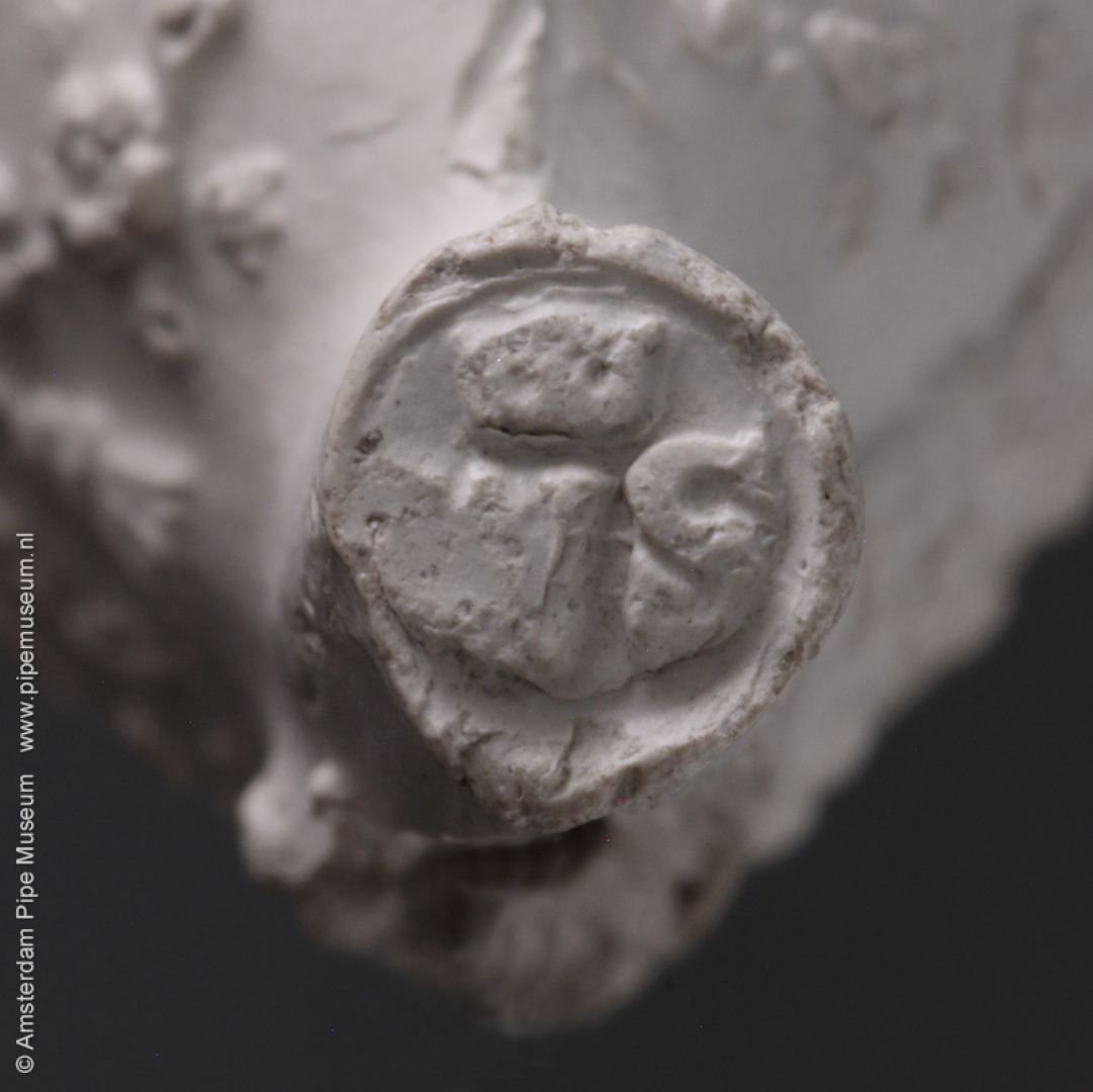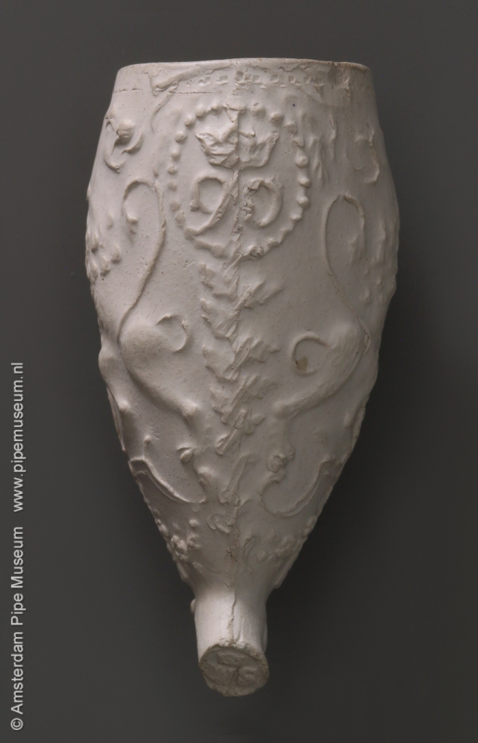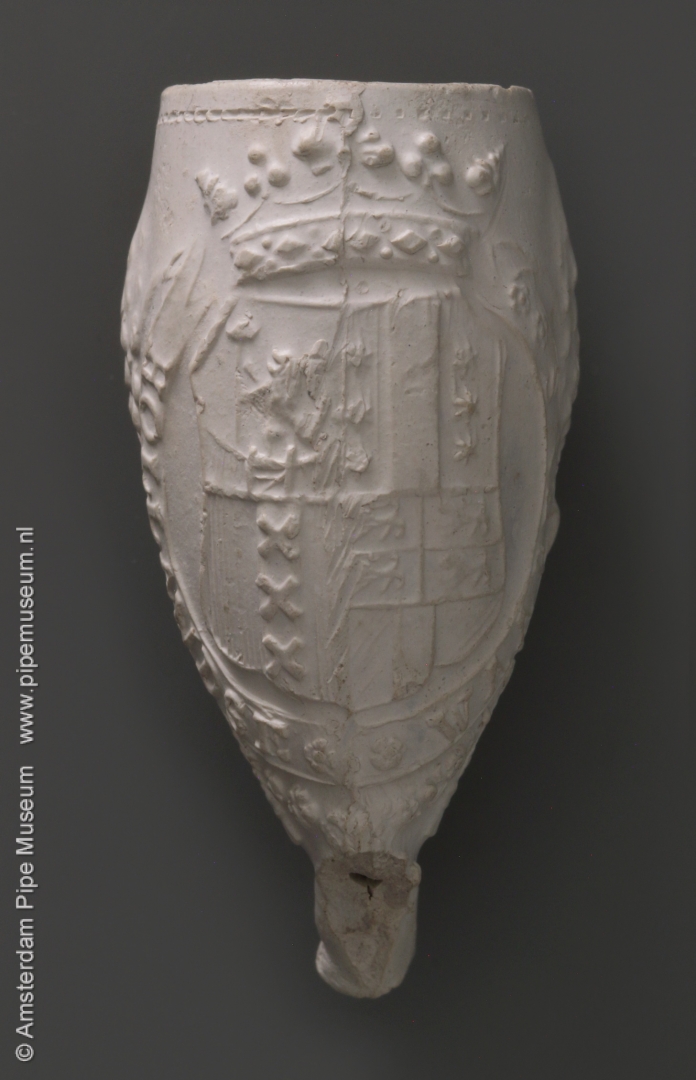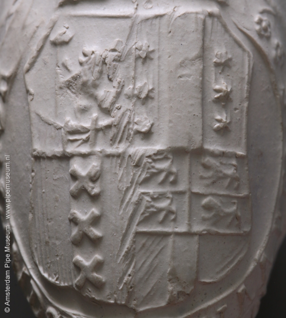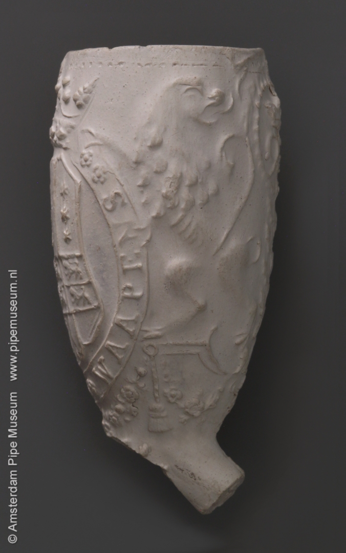 | Tabakspijp van klei met ovale ketel en hiel. Ketel steelzijde in reliëf gekroond wapenschild gevierendeeld met leeuw in de Hollandse tuin met staf met vrijheidshoed en wapens van Gouda, Amsterdam en Rotterdam, omsloten door lint met "HOLLANDSE WAAPENS" en gehouden door staande leeuwen met afgewende kopen. Ketel keerzijde in reliëf merk 90 gekroond in parelcirkel, vormnaad blaadjes. |
