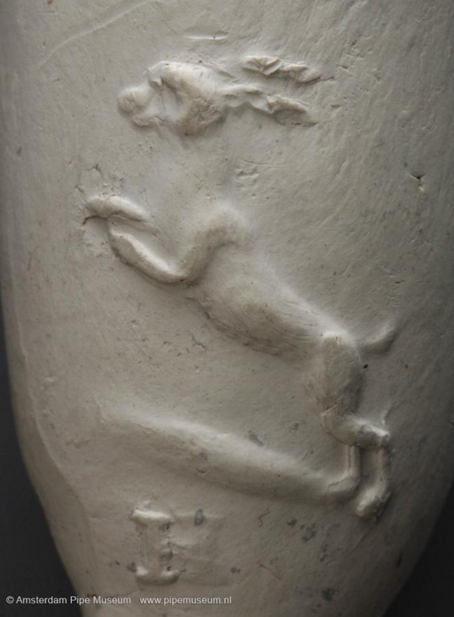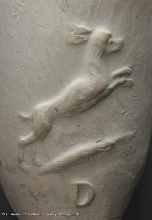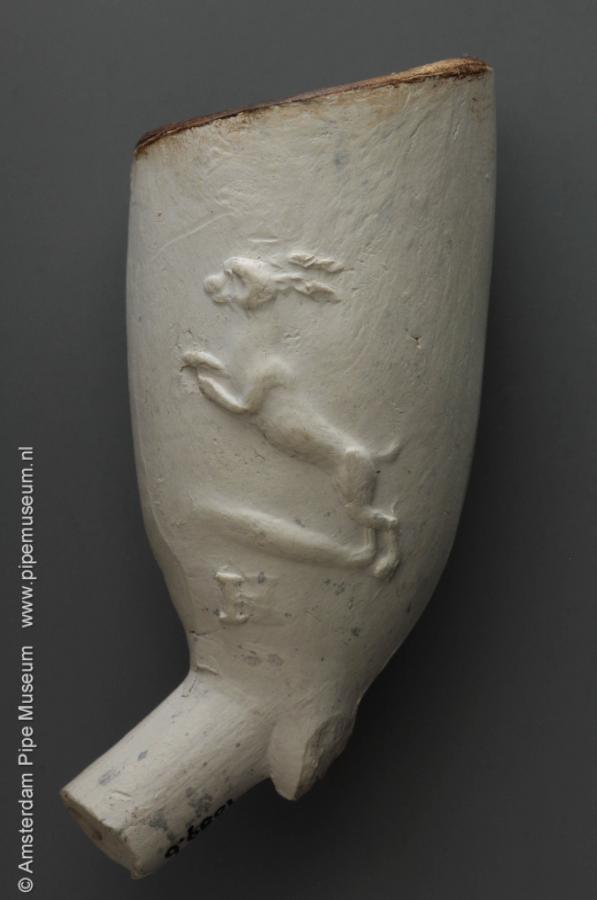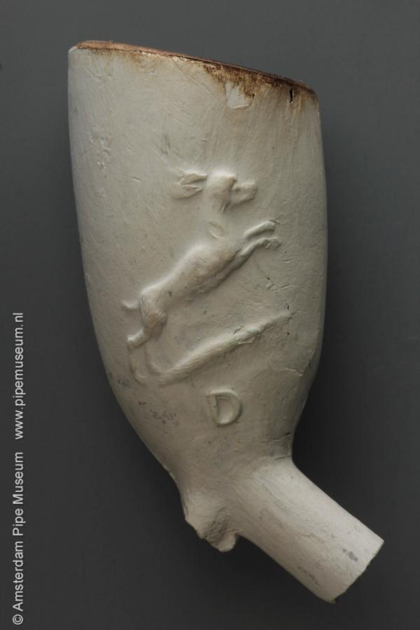 | Tabakspijp van klei met trechtervorm ketel, spoor en rechte steel. Ketel rechts in reliëf zijmerk springende hond met initialen D en H. |