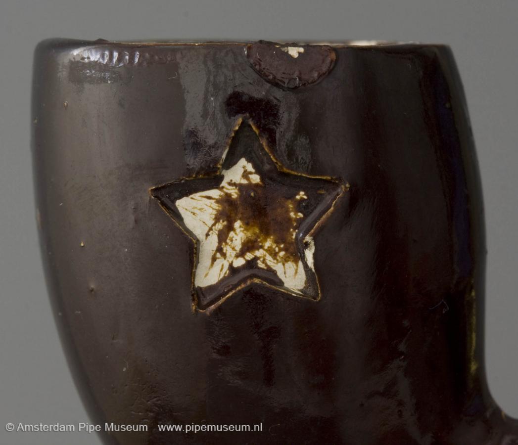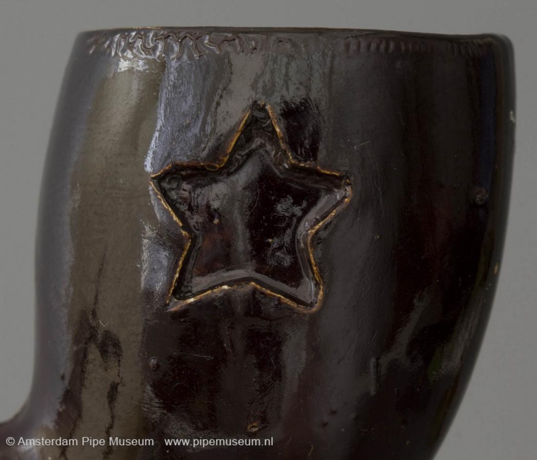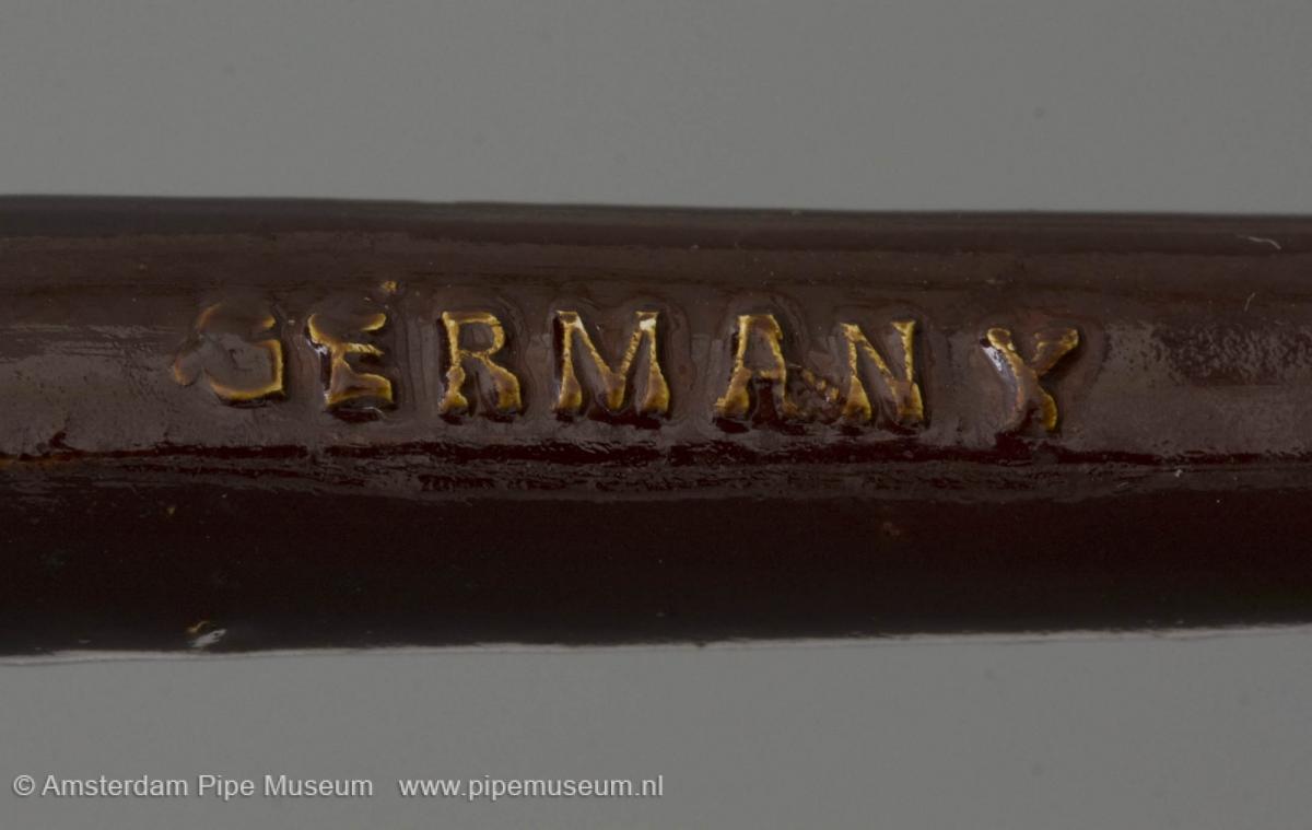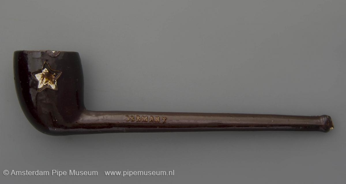 | Shagpijp van klei met Duitser ketel, zonder hiel en rechte steel met knoop. Snijfilt. Ketel weerszijden verdiept een vijfpuntige ster om glazen sterretje in te plakken. Steel links in reliëf "GERMANY". Geheel bedekt met bruingebrande lak. |