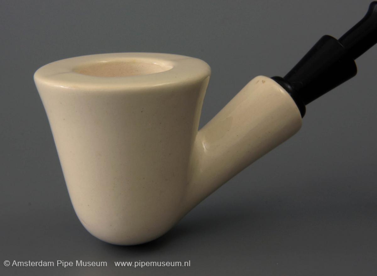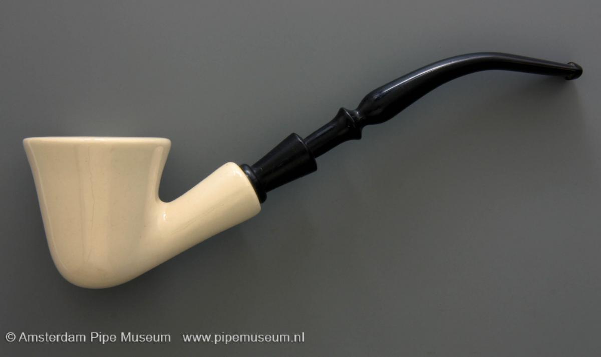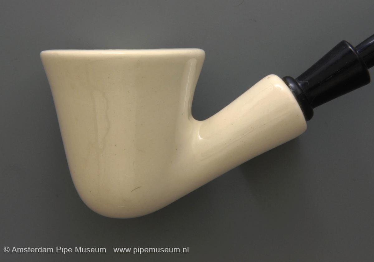Tabakspijp van gietklei met holwandige komvorm ketel met licht uitstaande wand en brede vlakke bovenrand, zonder hiel met oplopende steel met verwijdend eind. Oorspronkelijke montage met zwarte plastic stop waarin een zwart plastic insteekroer met balusterknoop en afgeplat eind. |