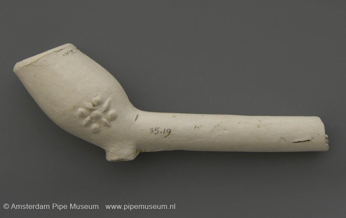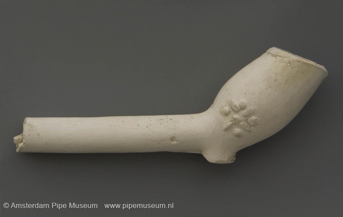 Tabakspijp van klei met dubbelconische ketel, hiel en rechte steel. Filtradering steelzijde. Ketel weerszijden in reliëf stippelroos met vier bladeren en kelkbladen. |