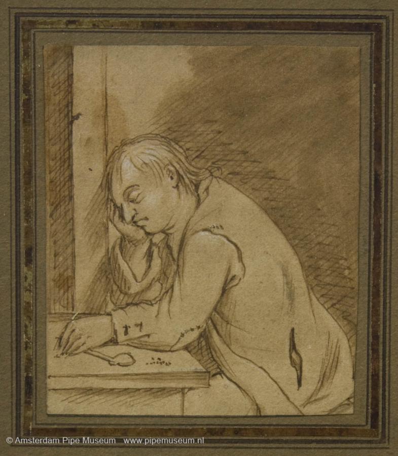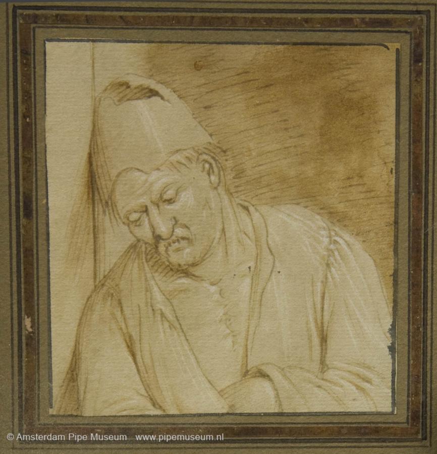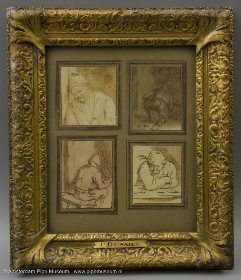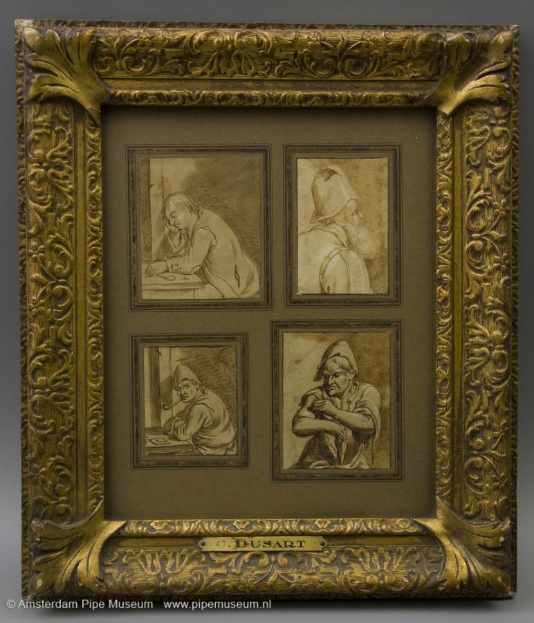 | Twee sets van vier tekeningen met inkt geplakt op karton en in lijst, de tekeningen stellen verschillende mannen voor, enkele ervan met een kleipijp in de hand of tussen de tanden, opgeplakt op donker karton met gouden biezen en in een goudkleurige gipslijst, aan de onderzijde een naamschildje waarop "C. DUSART". |