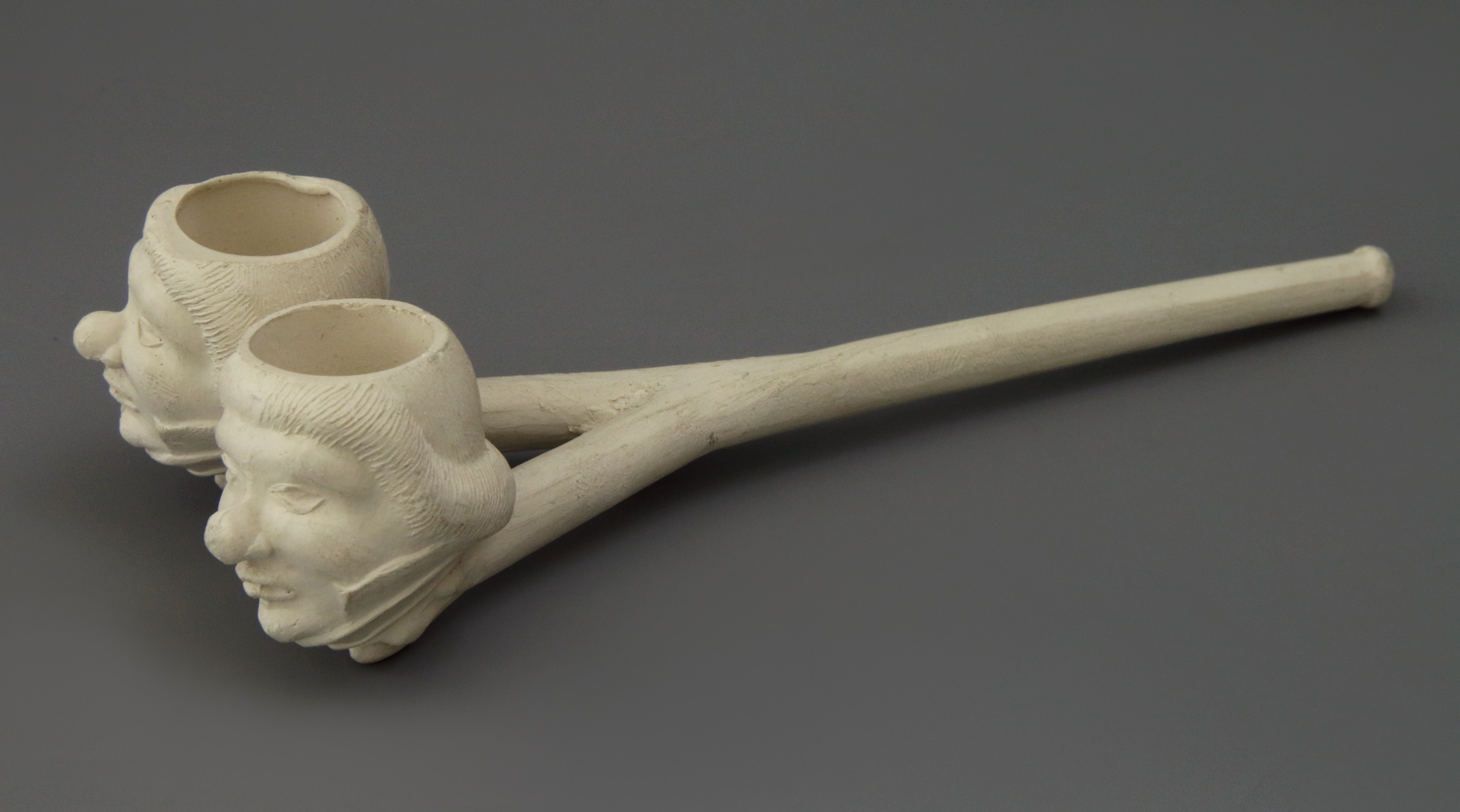 | Tabakspijp van klei met naast elkaar twee identieke figurale ketels, hielmarkering en rechte steel die in een enkele steel doorgaat naar een knopmondstuk. Ketel hoofd van een clowneske figuur met het haar in een rol rond het hoofd, een opstaande boord en onder de ketels een knorrenmotief. |