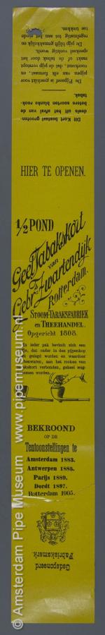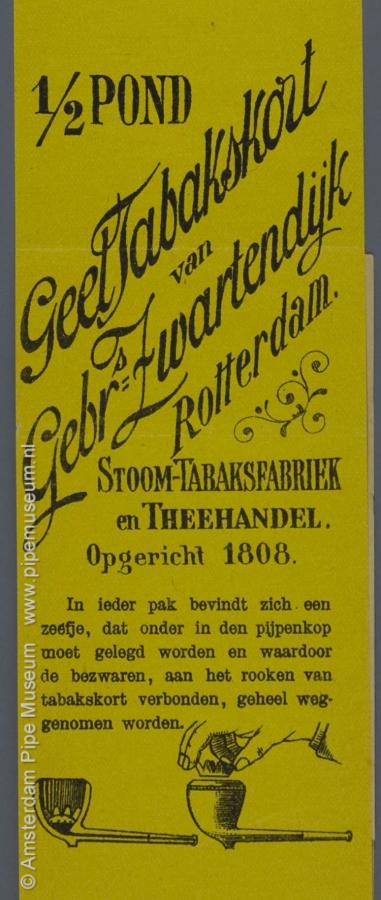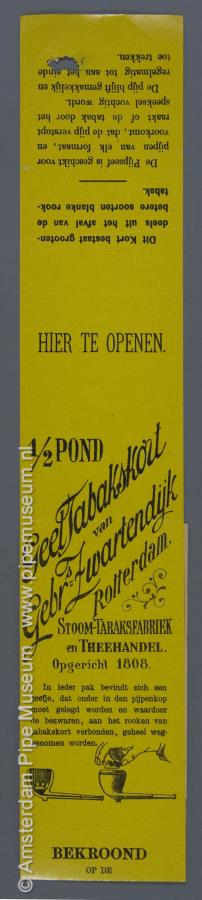 | Tabakswikkel van geel papier met lang smal model met centraal deels schuins "1/2 POND GEEL TABAKSKORT VAN GEBR. ZWARTENDIJK ROTTERDAM." en eronder "STOOM-TABAKSFABRIEK EN THEEHANDEL OPGERICHT 1808", gevolgd ÏN IEDER PAK BEVINDT ZICH EEN ZEEFJE, DART ONDER IN DEN PIJPENKOP MOET GELEGD WORDEN EN WAARDOOR DE BEZWAREN, AAN HET ROOKEN VAN TABAKSKORT VERBONDEN, GEHEEL WEGGENOMEN WORDEN" met voorbeeld van twee pijpen, bij de rechter wordt een inzet in de ketel geplaatst, daaronder "BEKROOND OP DE TENTOONSTELLINGEN TE AMSTERDAM 1883, ANTWERPEN 1885, PARIJS 1889, DORDT 1897, ROTTERDAM 1905", daaronder ondersteboven "GEDEPONEERD FABRIEKSMERK" en wapen met driemaal drieklaver en helm met gestileerde dekkleden, bovenzijde "HIER TE OPENEN" en ondersteboven geheel bovenaan "DIT KORT BESTAAT GROOTENDEELS UIT HET AFVAL VAN DE BETERE SOORTEN BLANKE ROOKTABAK" en "DE PIJPEZEEF IS GESCHIKT VOOR PIJPEN VAN ELK FORMAAT, EN VOORKOMT DAT DE PIJP VERSTOPT RAAKT OF DE TABAK DOOR HET SPEEKSEL VOCHTIG WORDT, DE PIJP BLIJFT GEMAKKELIJK EN REGELMATIG TOT AAN HET EINDE TOE TREKKEN". |