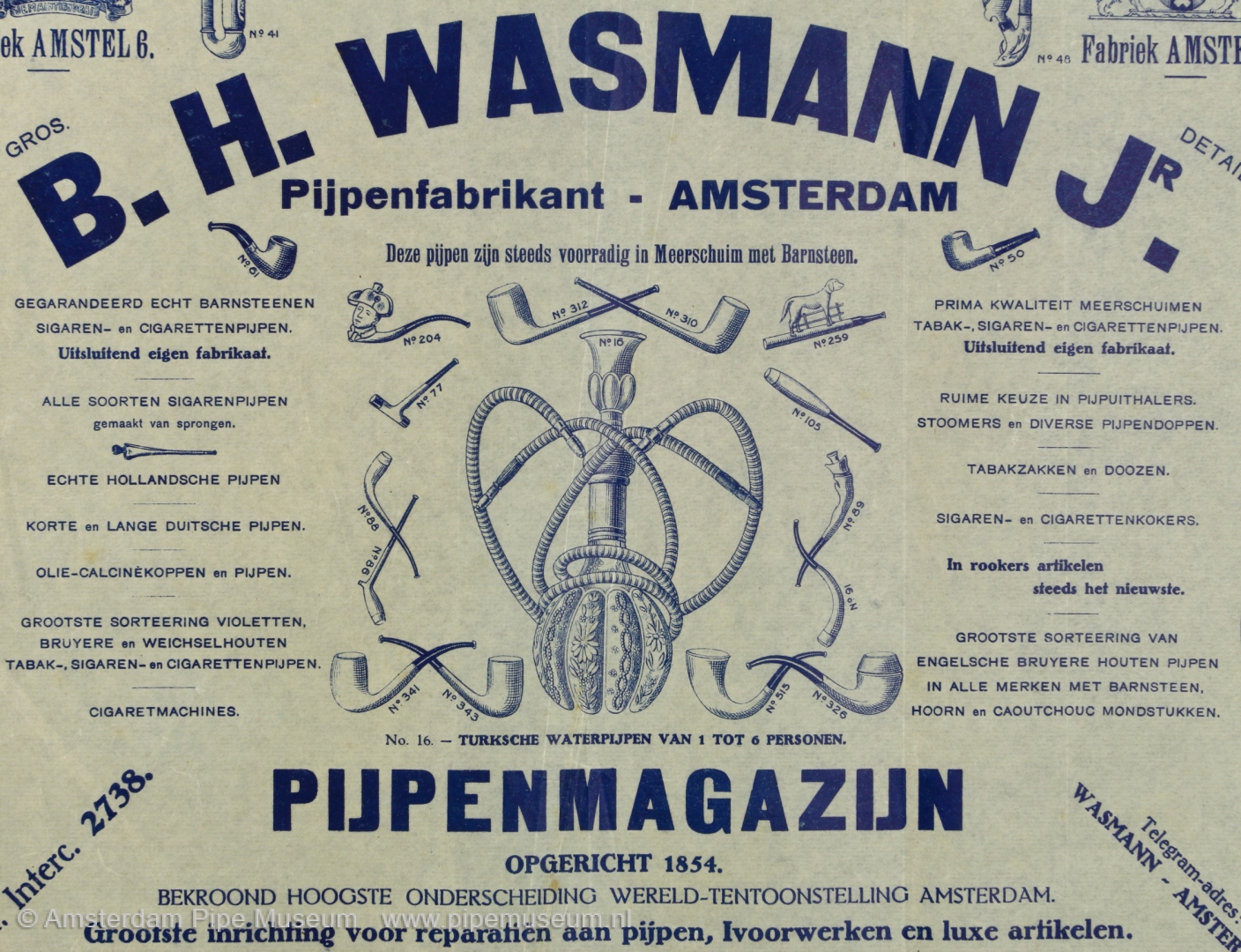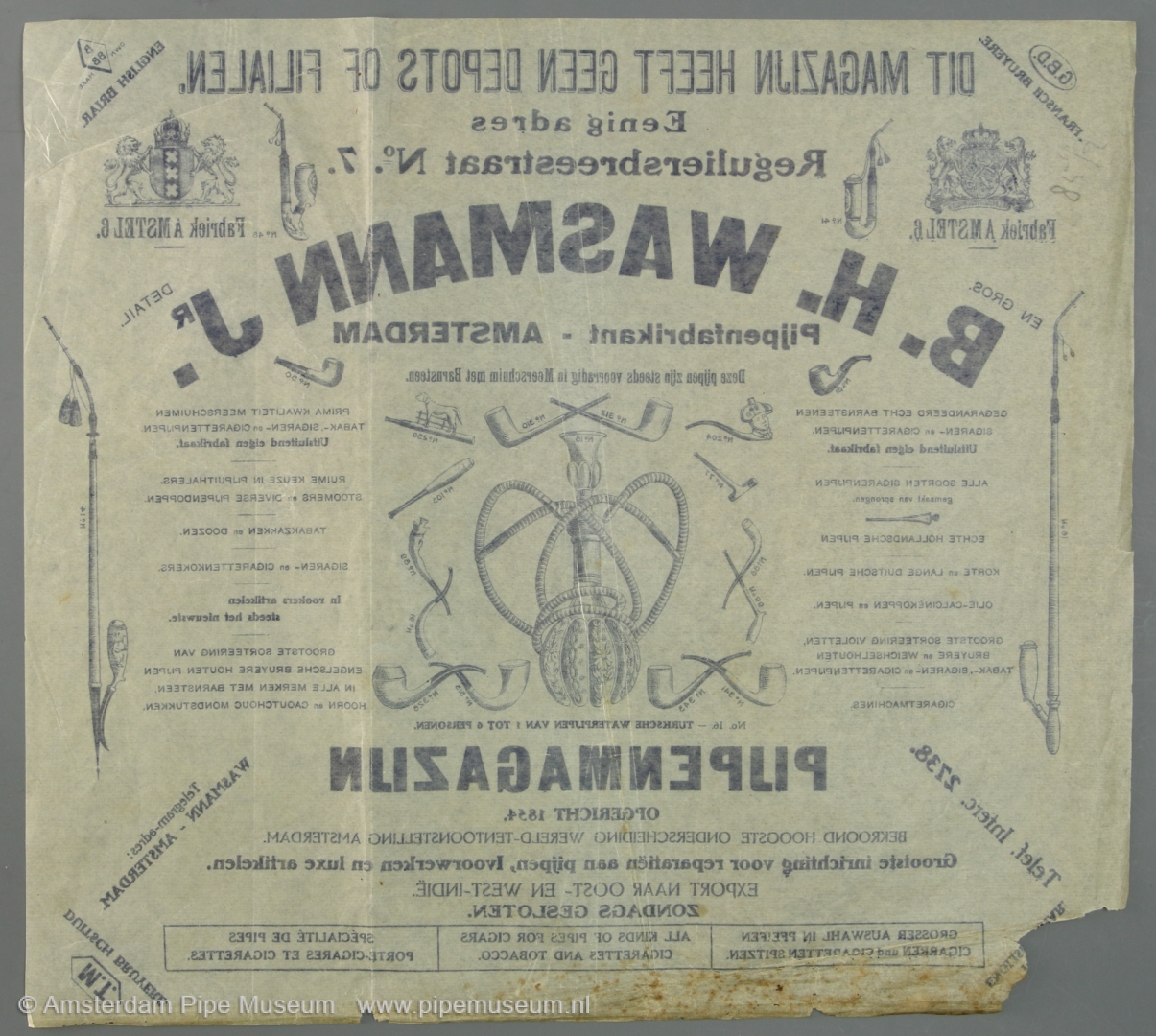 | Vloeipapier met reclame voor de pijpenfabriek en winkel van Wasmann in Amsterdam met centraal gedrukt in blauwe inkt de afbeelding van een Weense waterpijp met versierde glazen fles en geribbelde slang omgeven door meerschuimen pijpen en sigarenhouders en enkele kleipijpen alles voorzien van modelnummers met erboven "DEZE PIJPEN ZIJN STEEDS VOORRADIG IN MEERSCHUIM EN BARNSTEEN.", langs de bovenrand "DIT MAGAZIJN HEEFT GEEN DEPOTS OF FILIALEN, EENIG ADRES REGULIERSBREESTRAAT NO. 7", linker bovenhoek onder het Nederlandse wapen "FABRIEK AMSTEL 6.", rechter bovenhoek onder het wapen van Amsterdam "FABRIEK AMSTEL 6.". Beide zijkanten diverse kwalificaties als "ALLE SOORTEN SIGARENPIJPEN GEMAAKT VAN SPRONGEN.", "ECHTE HOLLANDSCHE PIJPEN.", "KORTE EN LANGE DUITSCHE PIJPEN.", "CIGARETMACHINES.", "RUIME KEUZE IN PIJPUITHALERS, STOOMERS EN DIVERSE PIJPENDOPPEN.", "TABAKSZAKKEN EN DOOZEN.", in de hoeken linksboven "G.B.D. FRANSCHE BRUYERE.", rechts boven "BBB OWN MAKE ENGLISH BRIAR", rechts onder "M.T. DUITSCH BRUYERE" (linker onderhoek verdwenen). |