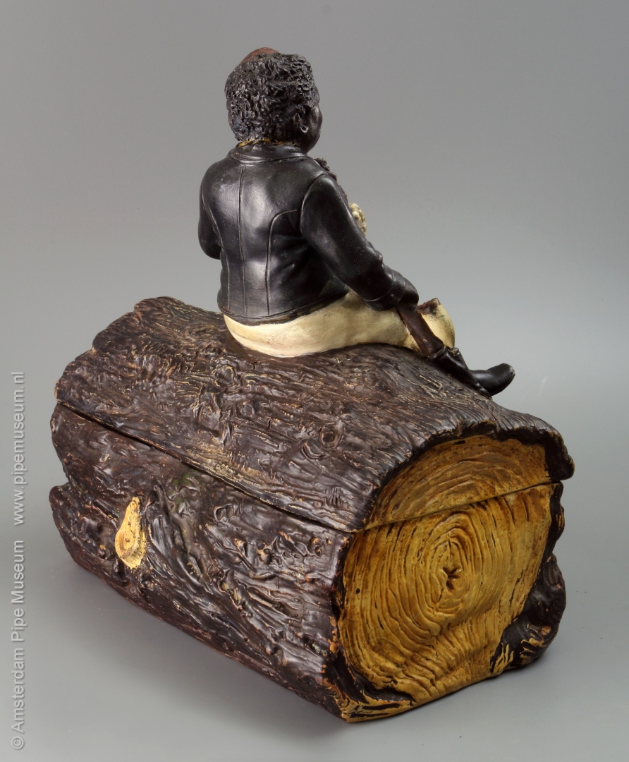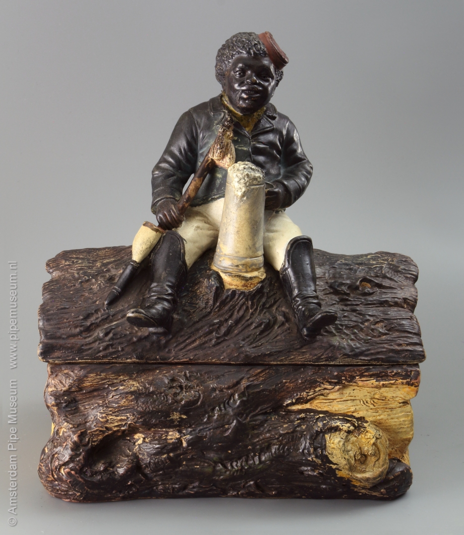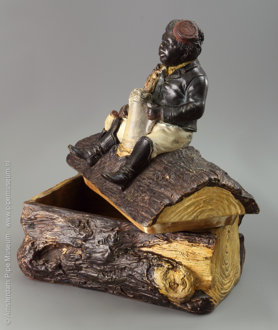 Tabakspot van gegoten aardewerk met rechthoekige doosvorm met afneembaar deksel, de doos uitgewerkt als een stuk boomstam waarop in hoogreliëf een zittende neger met rokerscap, een lange gesteckpfeife rokend, een grote bierpul met schuimkraag tussen de benen. Voorstelling in koude natuurlijke kleuren opgeschilderd. Bodem onderzijdfe intaglio merk "JM3 3352".