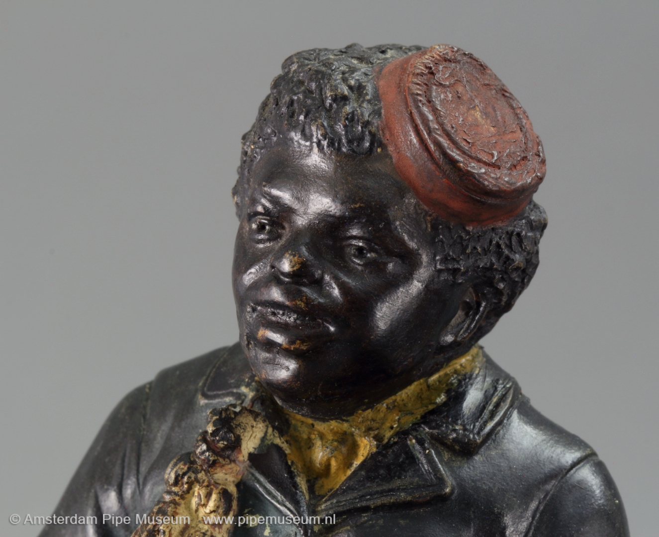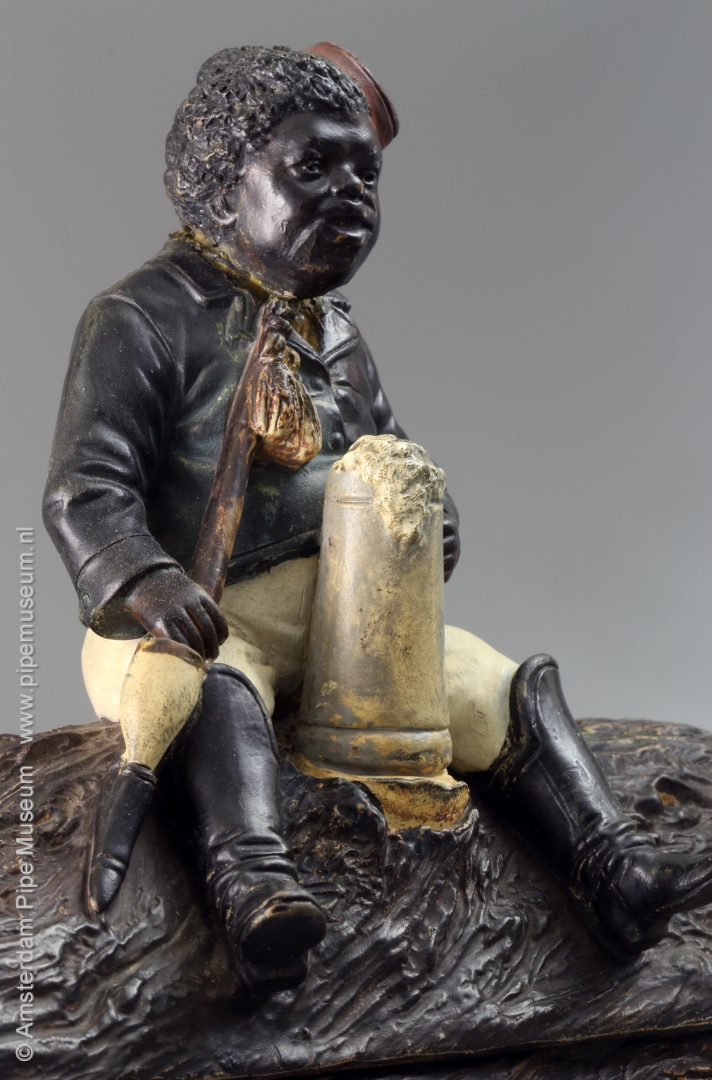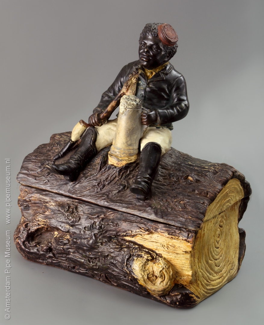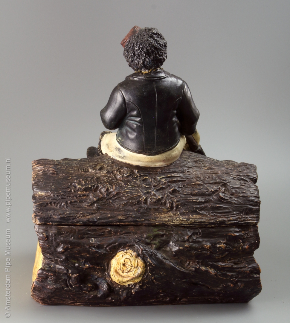 Tabakspot van gegoten aardewerk met rechthoekige doosvorm met afneembaar deksel, de doos uitgewerkt als een stuk boomstam waarop in hoogreliëf een zittende neger met rokerscap, een lange gesteckpfeife rokend, een grote bierpul met schuimkraag tussen de benen. Voorstelling in koude natuurlijke kleuren opgeschilderd. Bodem onderzijdfe intaglio merk "JM3 3352".