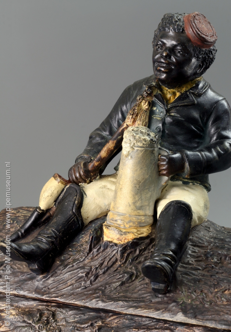 zittende neger met lange tabakspijp en bierhumpe
