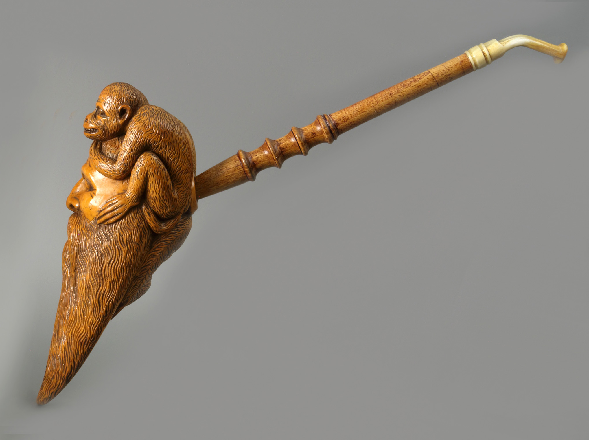Slechts zelden kunnen we bij snijwerk van pijpen een bepaalde ambachtsman of kunstenaar onderscheiden. Bij deze pijp is dat wel het geval. Van dit ontwerp zijn namelijk meerdere versies bekend die onmiskenbaar van dezelfde hand zijn. Dat blijkt niet alleen door het ongebruikelijke hout dat gebruikt is, maar vooral door de wijze van snijden. De pijp toont het hoofd van een man met lange baard in een punt die zo lang is dat deze comfortabel met de hand ondersteund kan worden. Rond de ketelopening is amusant snijwerk toegevoegd in de vorm van twee aapjes. Tenslotte vinden we aan de keerzijde nog een hondje dat aan de staart van een van de apen hangt. Kortom het gaat om een charmant object in ongebruikelijke vormgeving. Opvallend is de prachtige houtsoort waarvan dit voorwerp gemaakt is met nauwelijks nerven en een buitengewoon grote fijnheid. Tegenhanger van deze pijp, maar evident van dezelfde snijder, is een pijp in de collectie van Alice de Rothschild in Grasse. Die pijp toont het hoofd van een gladgeschoren man met op zijn voorhoofd eveneens twee apen, één ervan met een vrucht in de rechter voorpoot. Van die pijp zijn inmiddels drie exemplaren bekend, die bewijs zijn voor werk in serie. Van deze gebaarde versie is nog geen tweede exemplaar opgedoken. Is de stijl inmiddels herkenbaar, wat we helaas niet weten is de naam van de kunstenaar, noch waar deze pijpen zijn gemaakt of wanneer. Alleen toeval kan het antwoord op die vragen brengen.